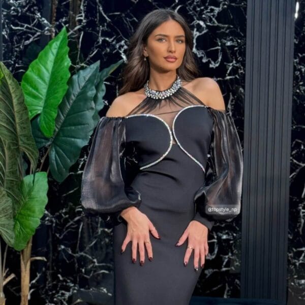 Midi haljina sa cirkonima oko vrata odiše luksuzom i elegancijom, savršen izbor za dame koje žele da zablistaju na svakoj svečanoj prilici. Ovaj model kombinuje sofisticiran kroj sa efektnim detaljima od cirkona koji prate liniju vrata i grudi, stvarajući glamurozan izgled. Providni til rukavi daju dodatnu notu romantike i profinjenosti, dok uski kroj savršeno ističe figuru.