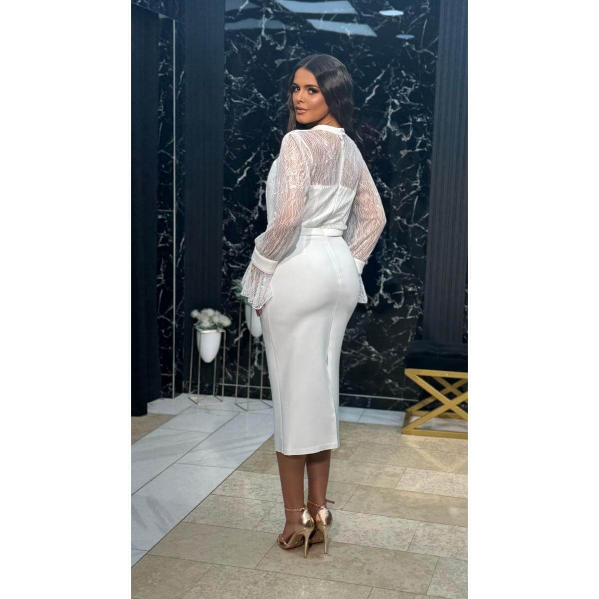 Ova elegantna bela midi haljina odiše romantikom i profinjenošću. Gornji deo haljine krase prefinjeni detalji od bele čipke koji joj daju nežan, ženstven izgled, dok donji deo pada ravno u jednostavnim linijama, naglašavajući figuru bez preteranog isticanja. Haljina dužine ispod kolena idealna je za svečane prilike, letnje proslave ili venčanja.