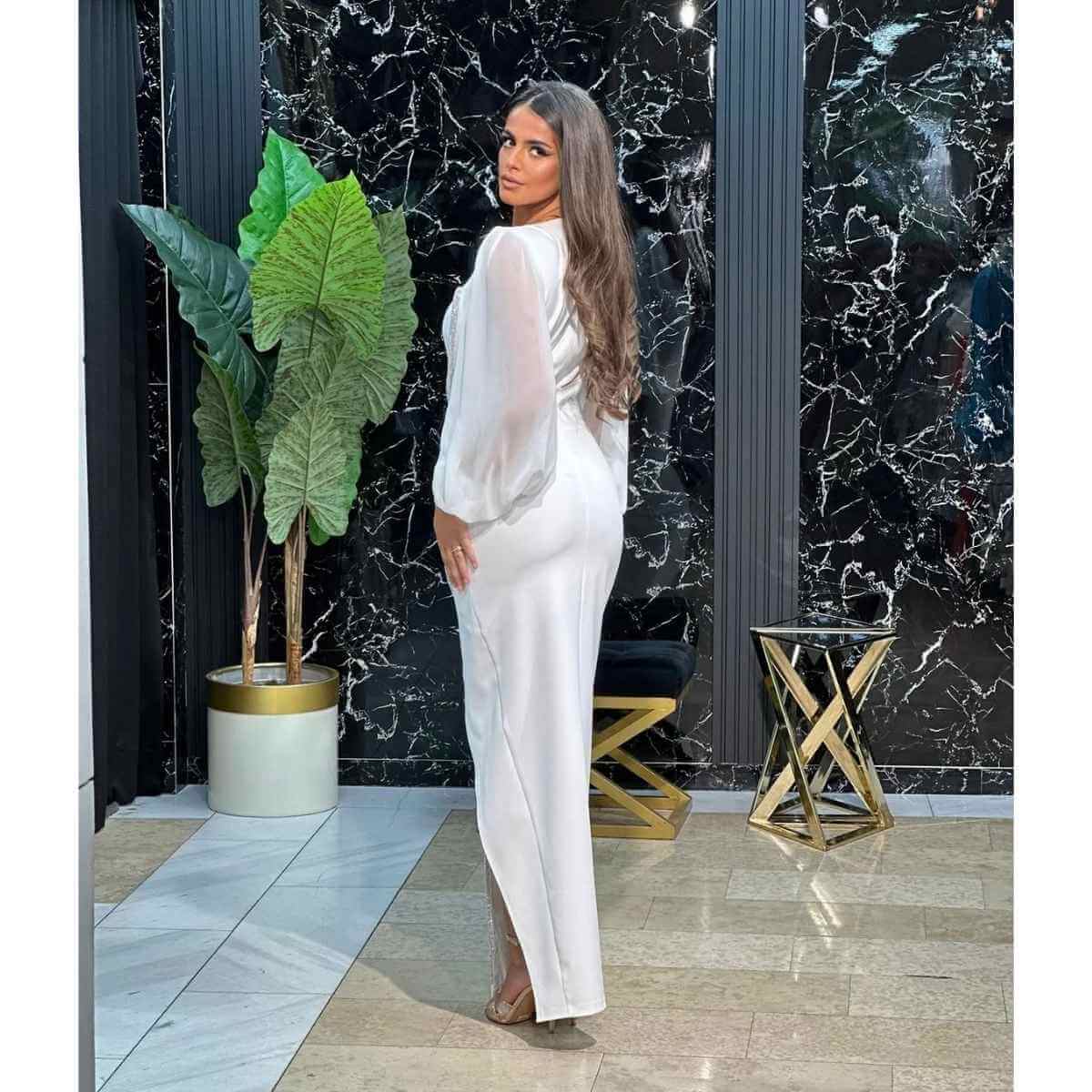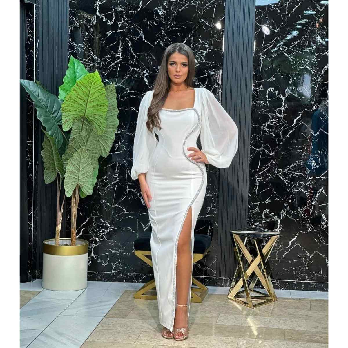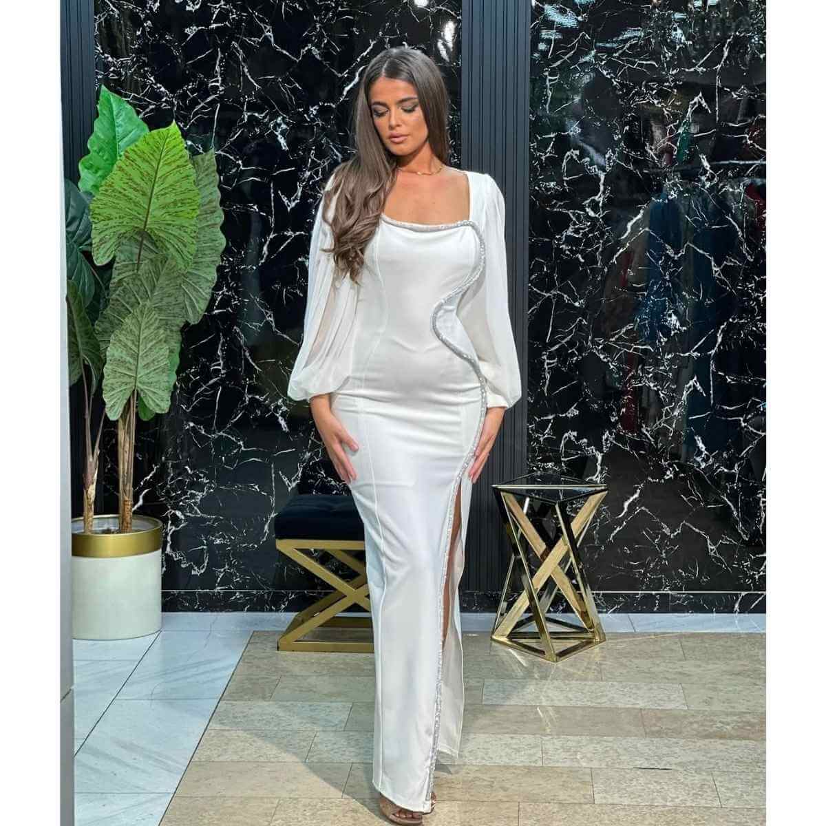 Ova bela uska maksi haljina odiše sofisticiranom elegancijom i savršen je izbor za posebne i svečane prilike. Kroj koji prati liniju tela ističe siluetu, dok minimalistički dizajn ostavlja snažan i profinjen utisak.