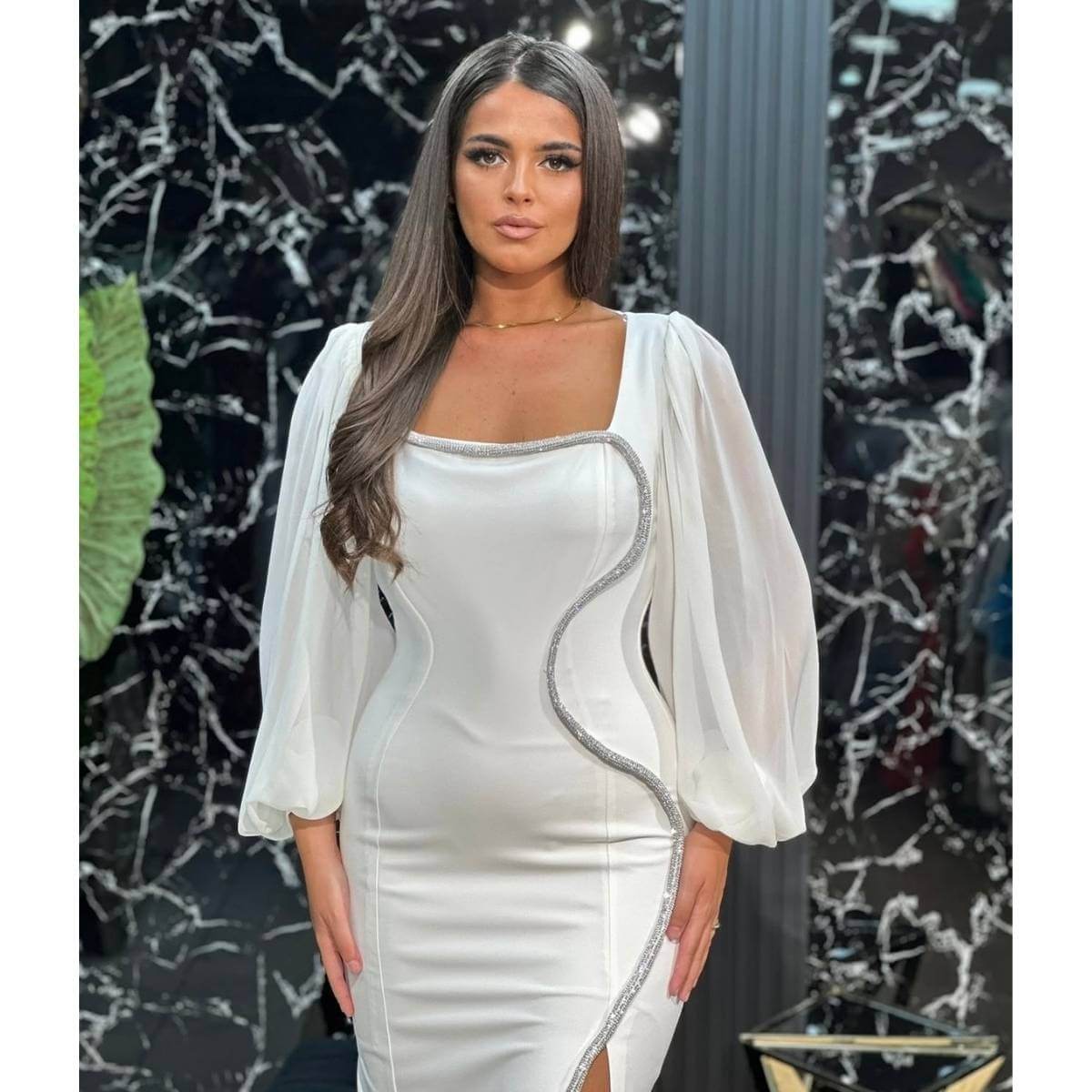 Haljina je upotpunjena laganim, providnim rukavima koji dodaju dozu nežnosti i elegancije, dok diskretni šlic omogućava slobodu pokreta i dodatno naglašava ženstvenost. Decentni detalji uz ivice haljine daju luksuzan završetak bez preterivanja.