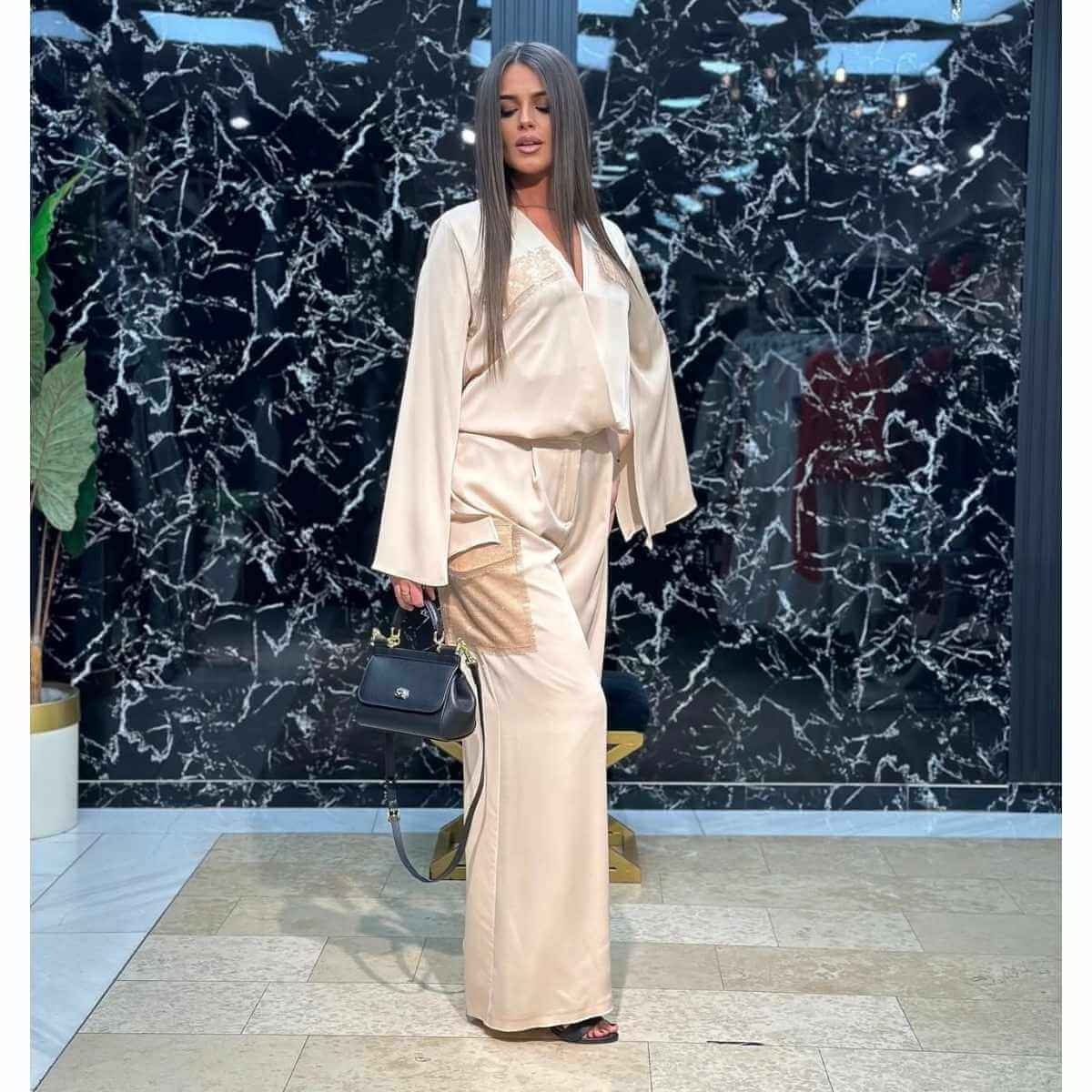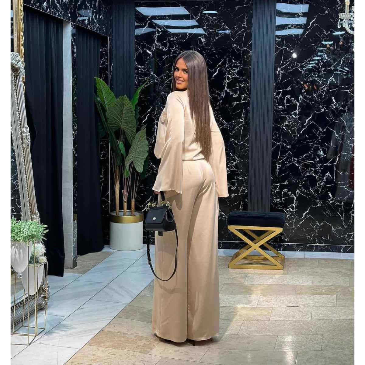 Bež satenski komplet – košulja i široke pantalone sa paricama