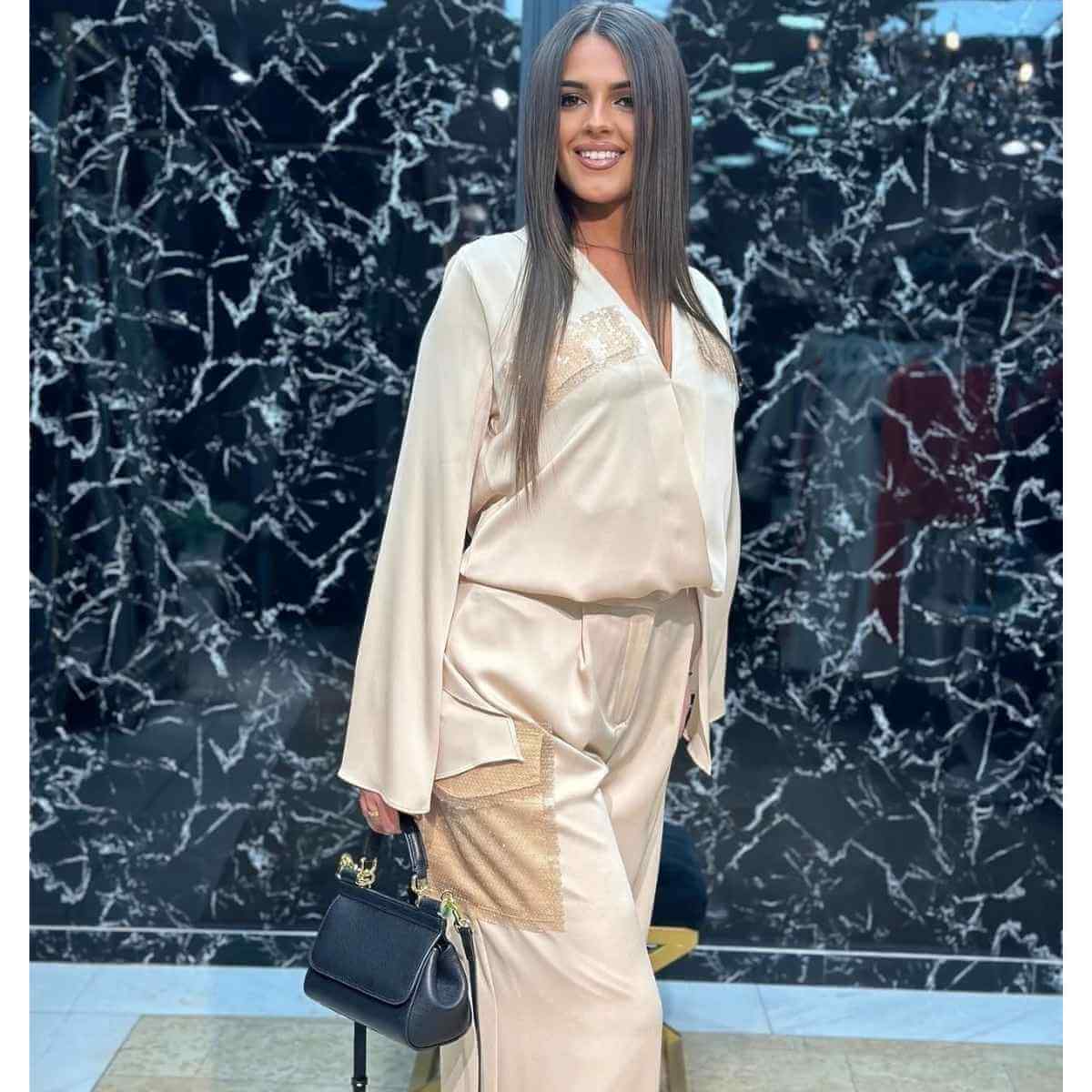 Bež komplet koji čine košulja klasičnog kroja i široke pantalone pruža lagan, ženstven i moderan izgled. Sjaj satenskog materijala daje kompletu posebnu notu elegancije, dok široke pantalone obezbeđuju udobnost i lepršav pad. Košulja je upotpunjena dekorativnim paricama na džepovima, koje služe kao upečatljiv detalj i daju kompletu diskretan akcenat. Idealan izbor za dnevne i večernje prilike, kao i za situacije kada želite spoj udobnosti i stila.