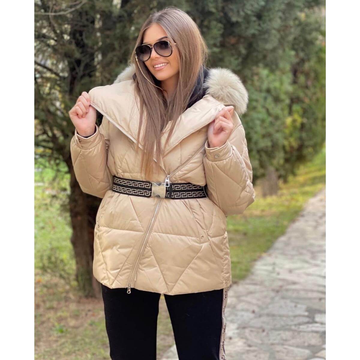 Bež zimska jakna sa prirodnim krznom i pojasom