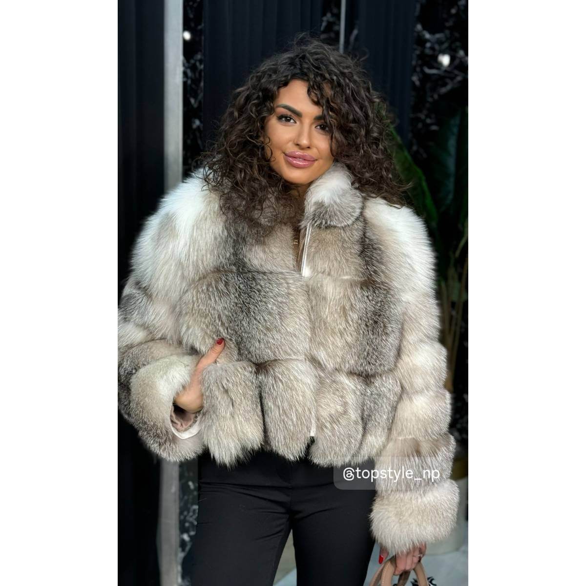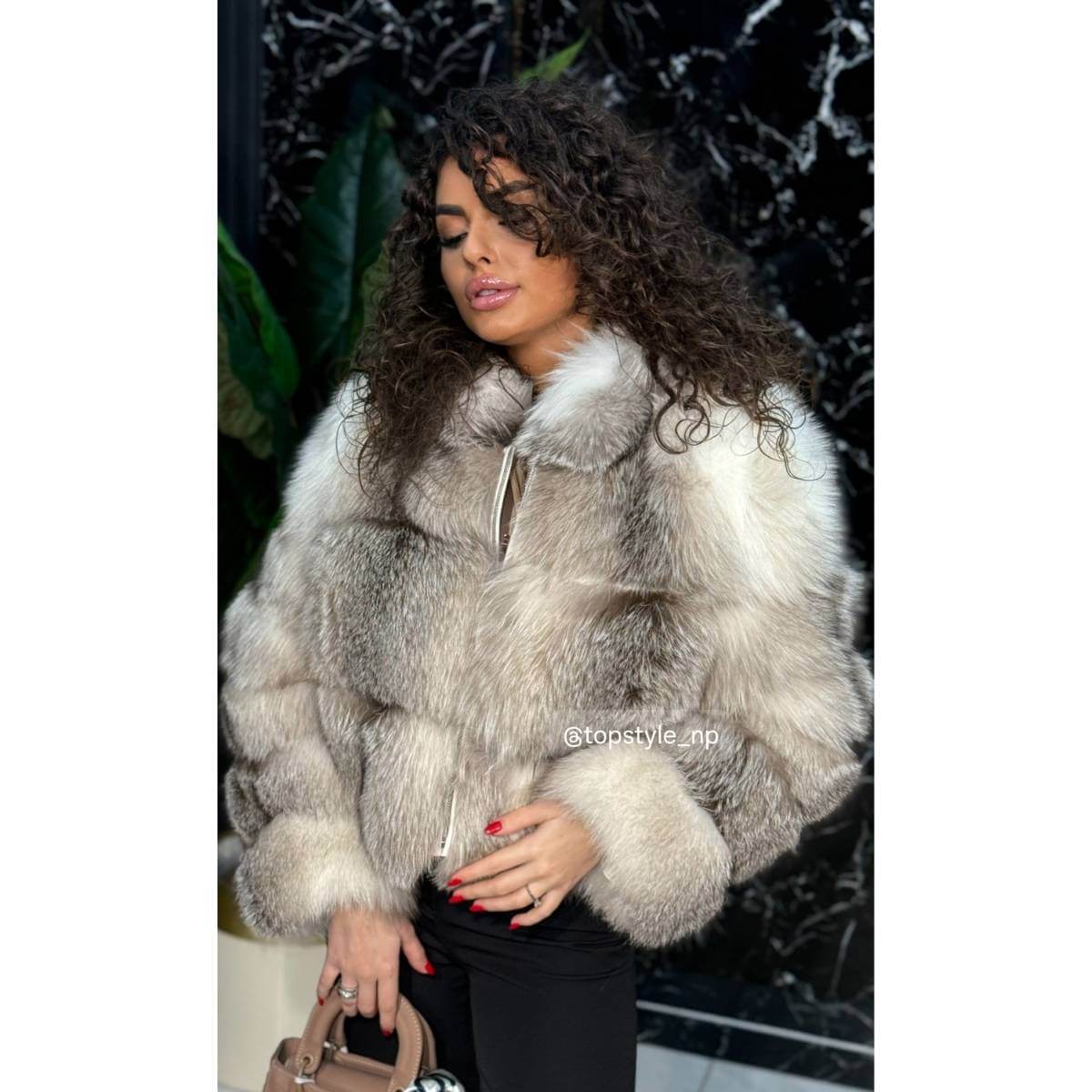 Bunda od polarne lisice izrađena je od prirodnog krzna vrhunskog kvaliteta, koje pruža izuzetnu mekoću, toplinu i postojan sjaj. Bogata tekstura i prirodni prelivi boja daju ovom modelu prefinjen i luksuzan izgled, dok je kroj pažljivo oblikovan da naglasi siluetu i obezbedi maksimalnu udobnost pri svakom pokretu.