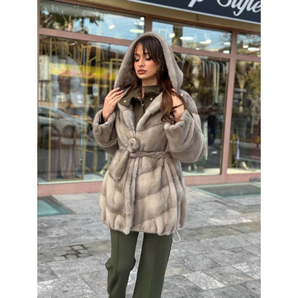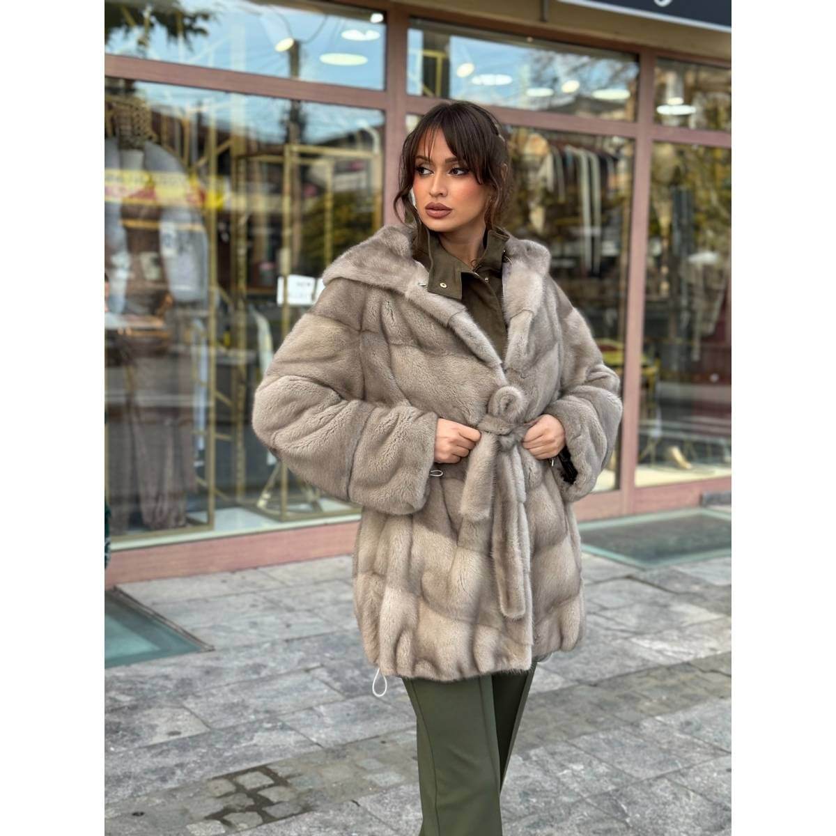 Ova ženska bunda od prirodnog krzna nerca srednje dužine sa kapuljačom i pojasom predstavlja savršen spoj luksuza, topline i savršeno oblikovane siluete. Izrađena je od najkvalitetnijeg nerc krzna, poznatog po svojoj jedinstvenoj mekoći, prirodnom sjaju i dugotrajnosti. Zahvaljujući vrhunskom materijalu, bunda pruža odličnu izolaciju, udobnost i premium osećaj pri svakom nošenju.
