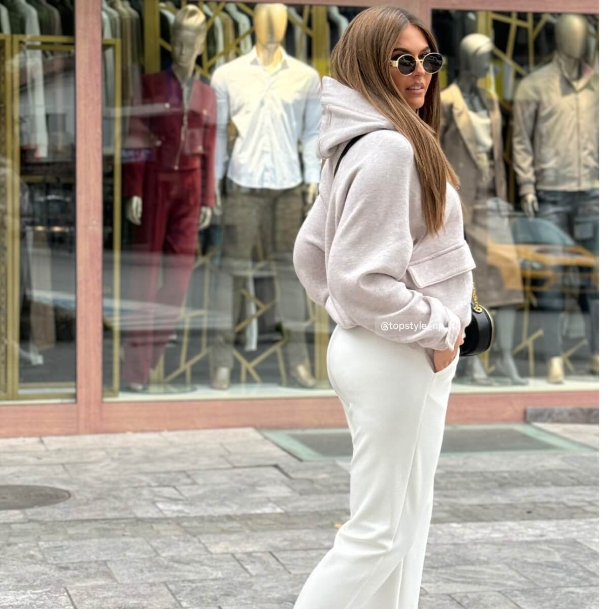 Ovaj casual komplet donosi savršenu ravnotežu između udobnosti i modernog stila. Bež duks sa kapuljačom jednostavnog dizajna lako se uklapa u svakodnevne kombinacije, dok bele pantalone ravnog kroja daju čist i uredan izgled celom outfitu. Mekan i prijatan materijal omogućava komfor tokom celog dana, bilo da ste u šetnji, na putu ili u opuštenim dnevnim aktivnostima. Idealan izbor za one koji vole sveden, ali stilizovan casual izgled.