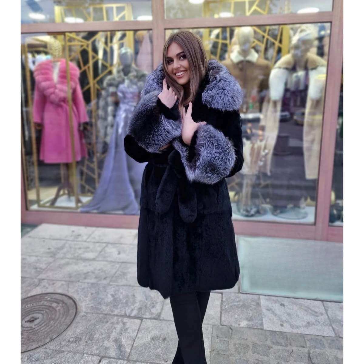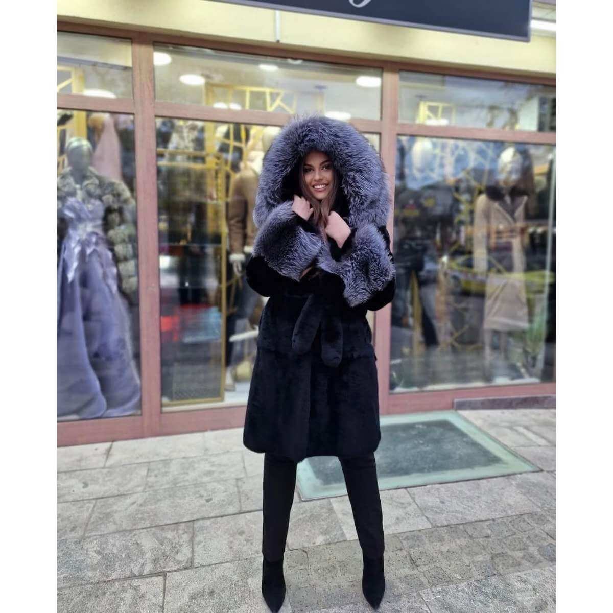 Crna bunda od prirodnog krzna sa raskošnom sivom kapom
