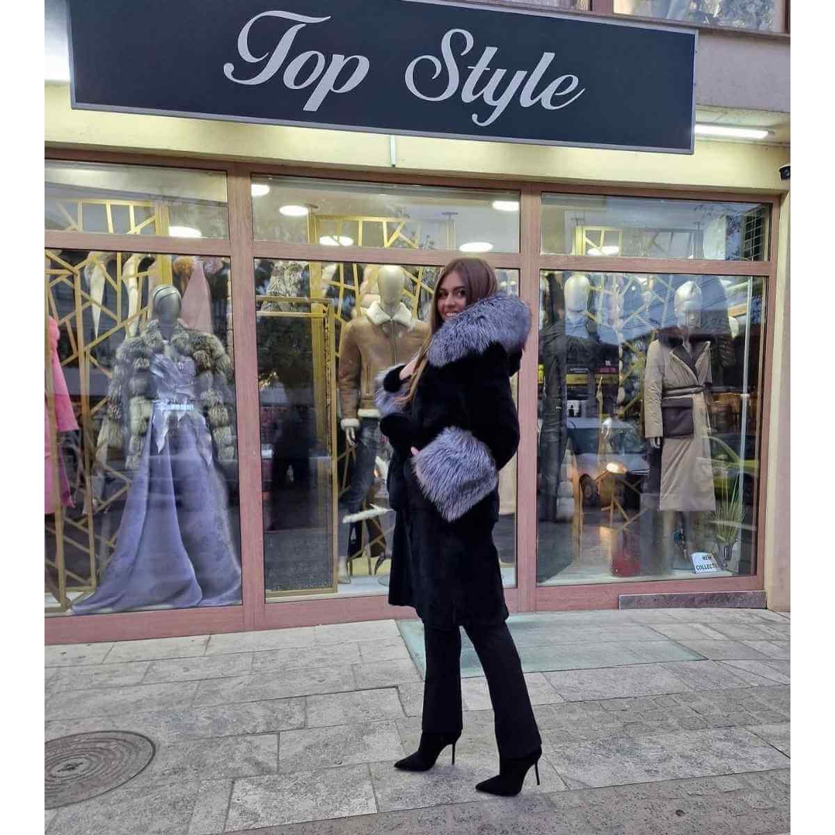 Ova crna bunda od prirodnog krzna odiše bezvremenom elegancijom i vrhunskim kvalitetom. Model je srednje dužine, krojen tako da lepo prati liniju tela, dok bogata kapa i rukavi od sivog prirodnog krzna daju upečatljiv i luksuzan izgled. Bunda je idealna za hladne zimske dane, pružajući maksimalnu toplinu i udobnost, uz snažan modni pečat. Savršen izbor za večernje izlaske, posebne prilike, ali i svakodnevne gradske kombinacije sa stilom.