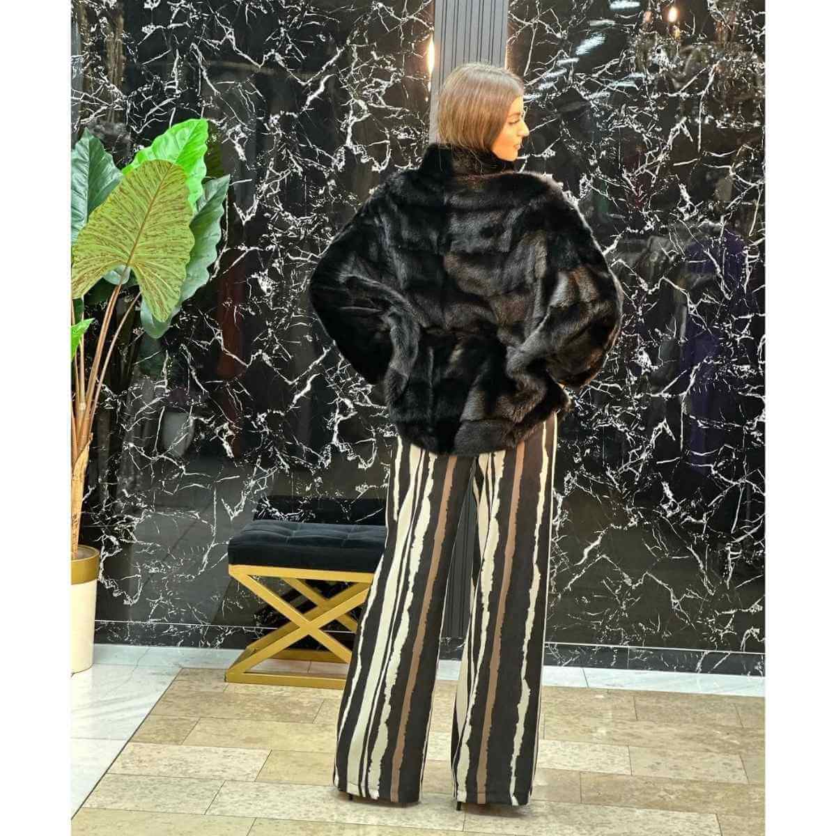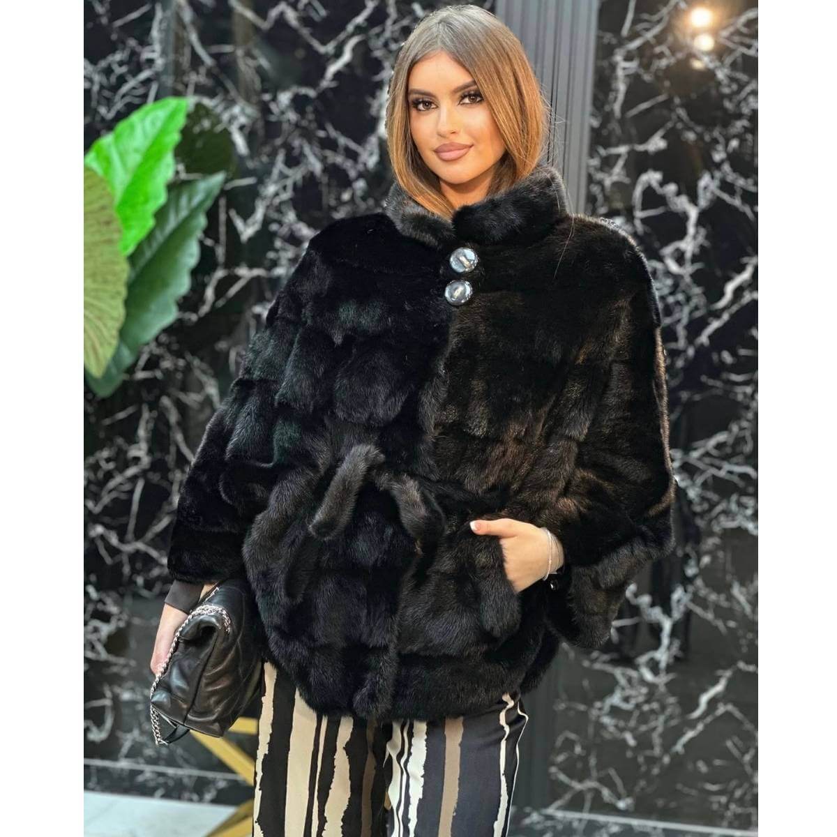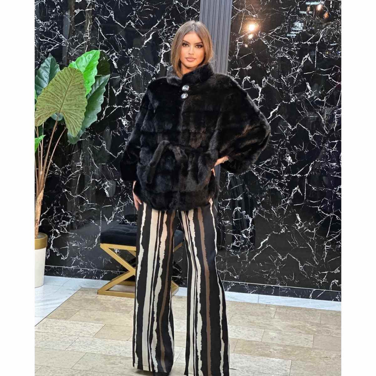 Crna bunda od prirodnog nerca srednje dužine odiše bezvremenskom elegancijom i luksuzom. Model je dizajniran sa dekorativnim dugmićima, pelerina rukavima i pojasom u struku, koji naglašava ženstvenu siluetu i omogućava savršeno prilagođavanje. Izrađena od visokokvalitetnog nerca, bunda pruža izuzetnu mekoću, toplinu i bogatu teksturu. Klasična crna boja čini ovaj model idealnim izborom za svečane prilike, večernje izlaske i sofisticirane zimske kombinacije.
