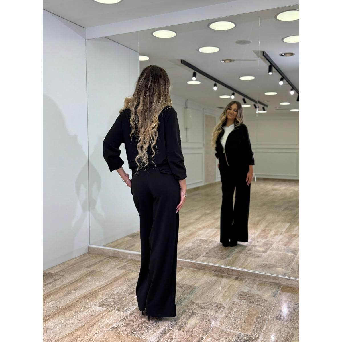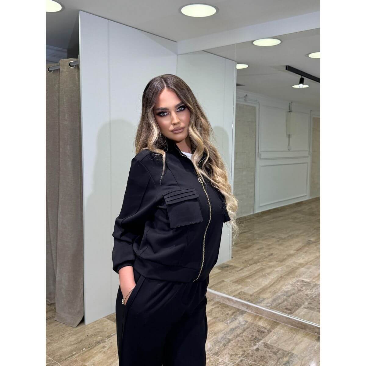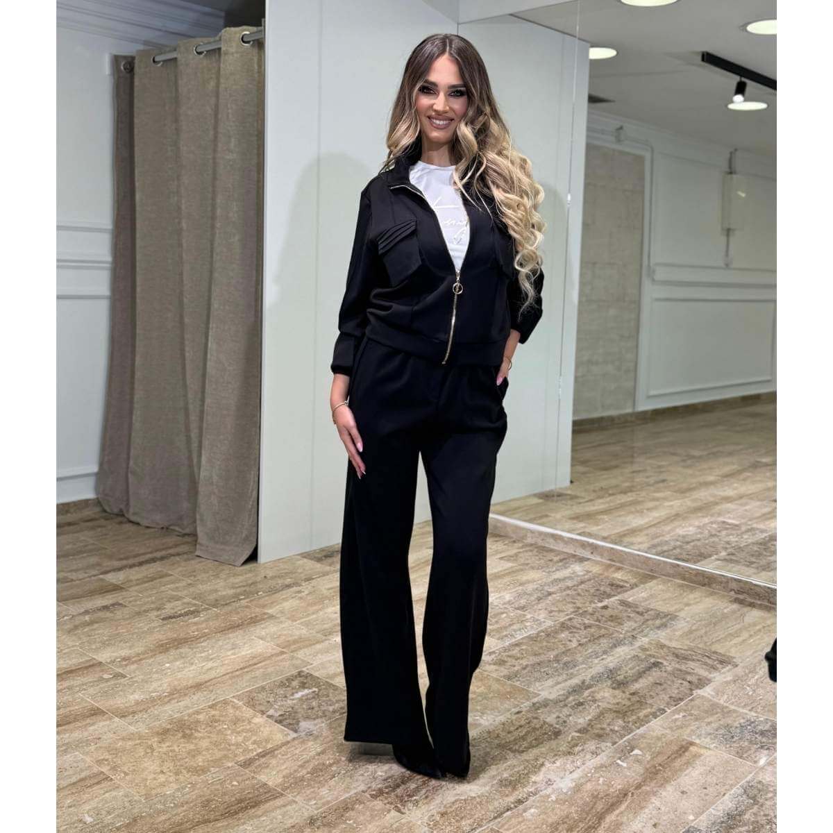 Moderan i praktičan trodelni komplet u crnoj boji koji spaja udobnost i urbanu eleganciju. Set se sastoji od kratkog duksa sa rajsferšlusom, jednostavne majice i pantalona širokog kroja koje vizuelno izdužuju siluetu. Minimalistički dizajn sa pažljivo postavljenim detaljima čini ovaj komplet idealnim za svakodnevne kombinacije, ali i za ležerne večernje izlaske.
