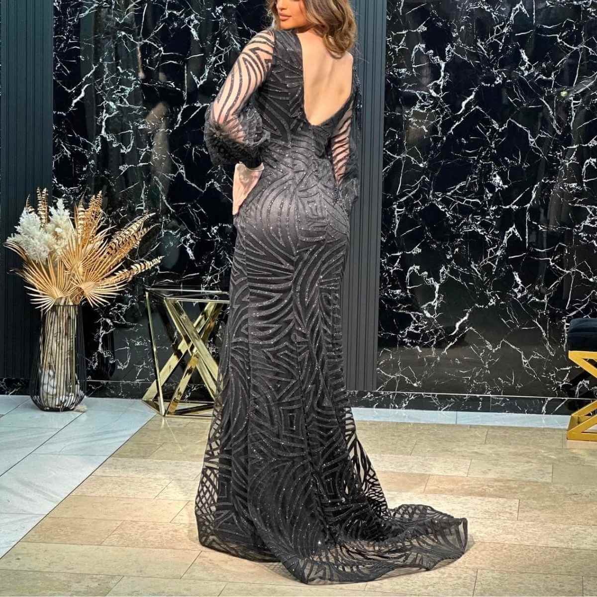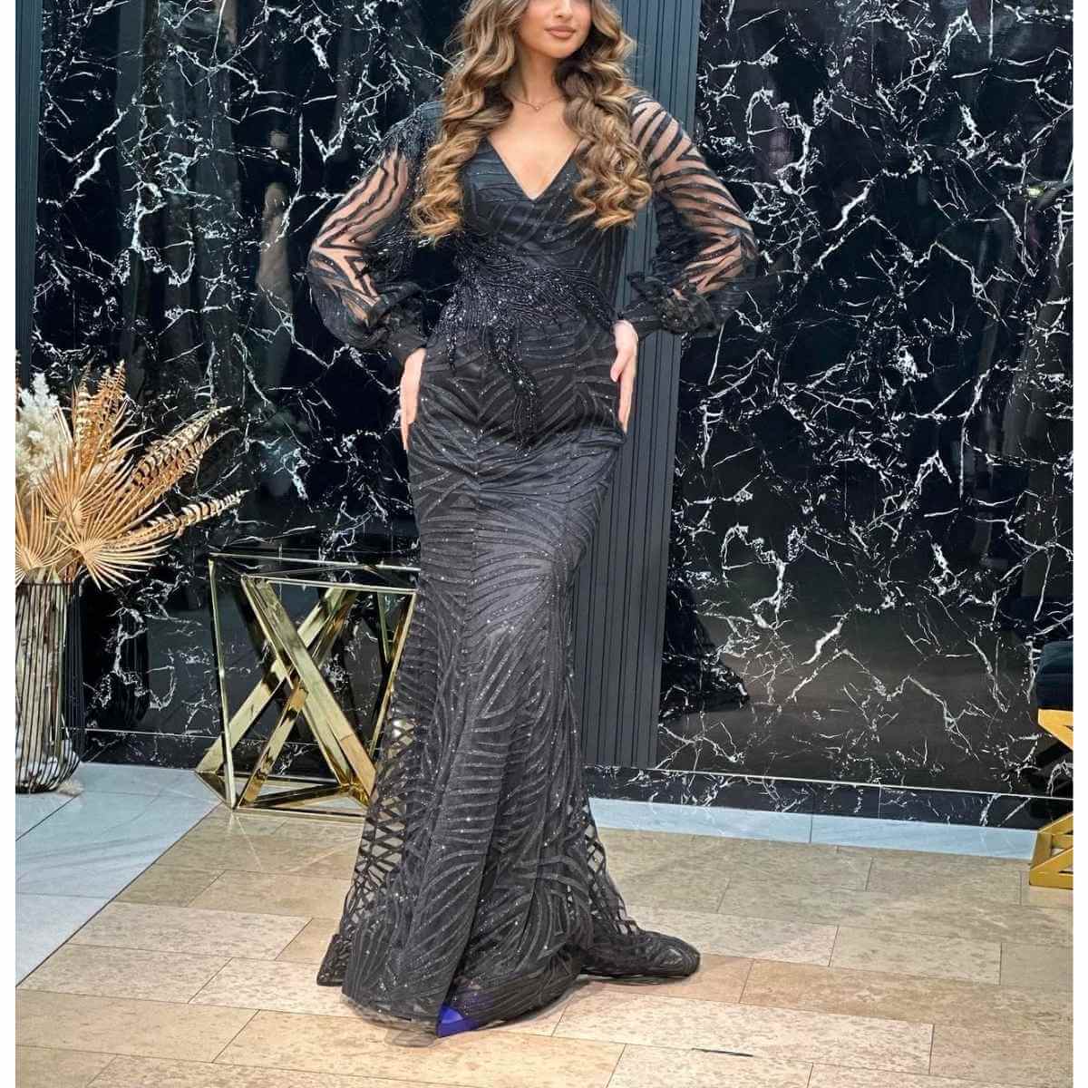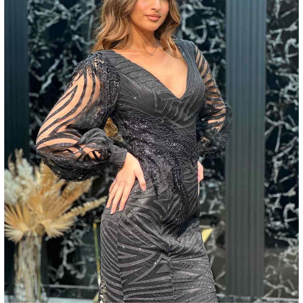 Duga elegantna haljina izrađena od luksuznog materijala sa prefinjenim sedefastim sjajem koji daje poseban efekat pri svakom pokretu. Model ima duboki V izrez koji ističe siluetu, kao i duge rukave koji doprinose sofisticiranom i ženstvenom izgledu. Poseban akcenat daje ručno rađeni crni cvetni detalj postavljen sa strane, koji haljini dodaje unikatnost i ekskluzivan karakter. Idealna je za svečane prilike, gala večeri, proslave i elegantne događaje gde želite da ostavite snažan i nezaboravan utisak.