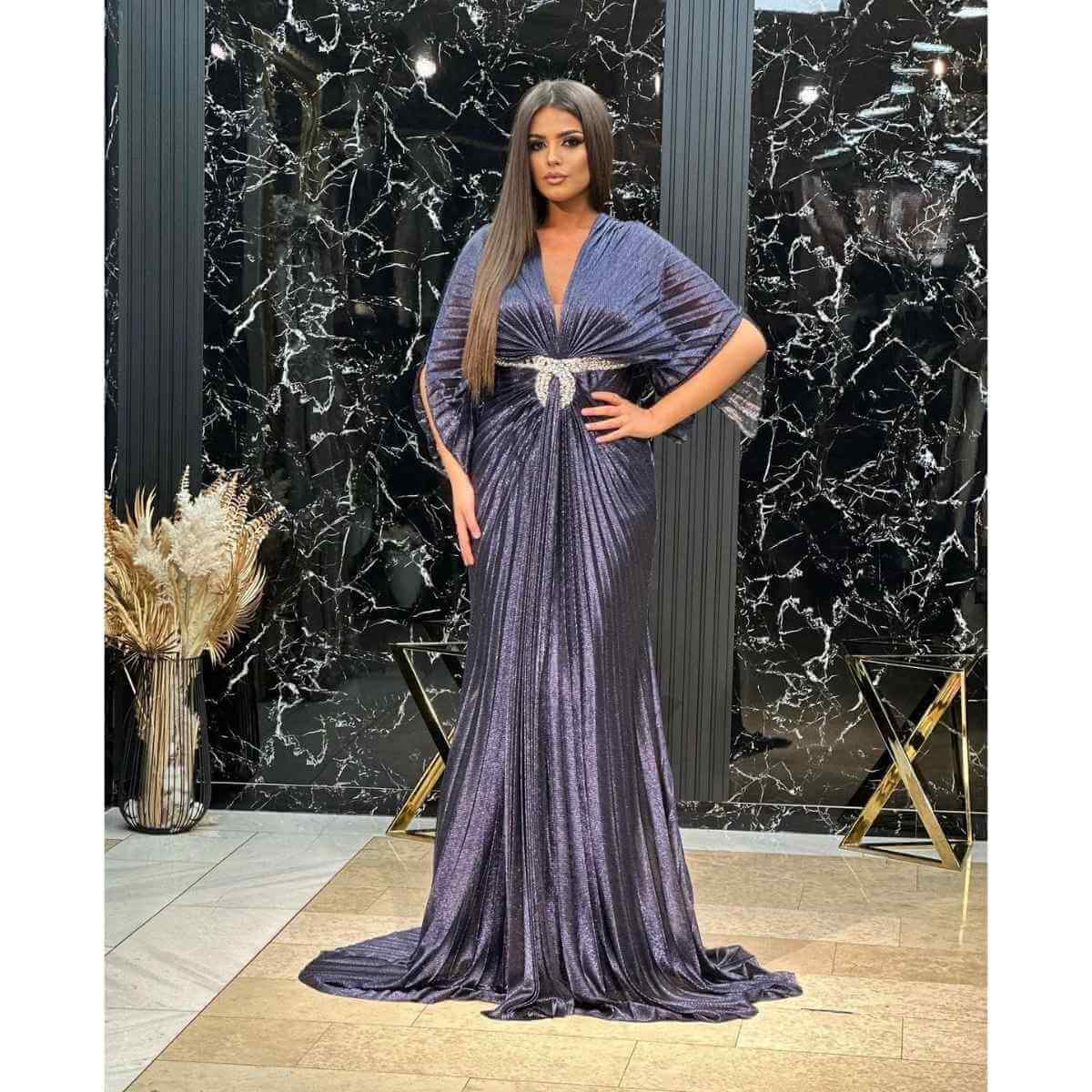 Duga elegantna plisirana haljina izrađena od luksuznog, sjajnog materijala koji daje sofisticiran i glamurozan izgled. Plisirani kroj lepo prati pokret tela i stvara laganu, fluidnu siluetu, dok pelerina rukavi dodaju posebnu dozu elegancije i profinjenosti. Haljina je savršen izbor za svečane prilike, večernje događaje, proslave i formalne ceremonije. Dostupna je i u klasičnoj crnoj boji, idealnoj za bezvremenski i upečatljiv stil.