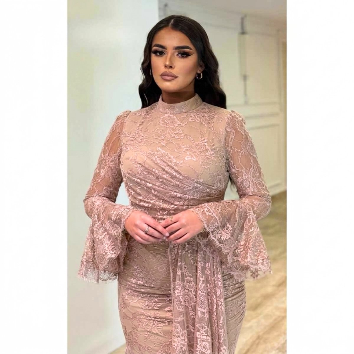 Model je dizajniran sa rolkom oko vrata koja daje profinjen izgled, dok široki rukavi dodaju dozu glamura i ističu romantičan karakter haljine. Dostupna je u braon i crvenoj boji, koje dodatno naglašavaju luksuzan izgled i omogućavaju izbor u skladu sa stilom i prilikom.