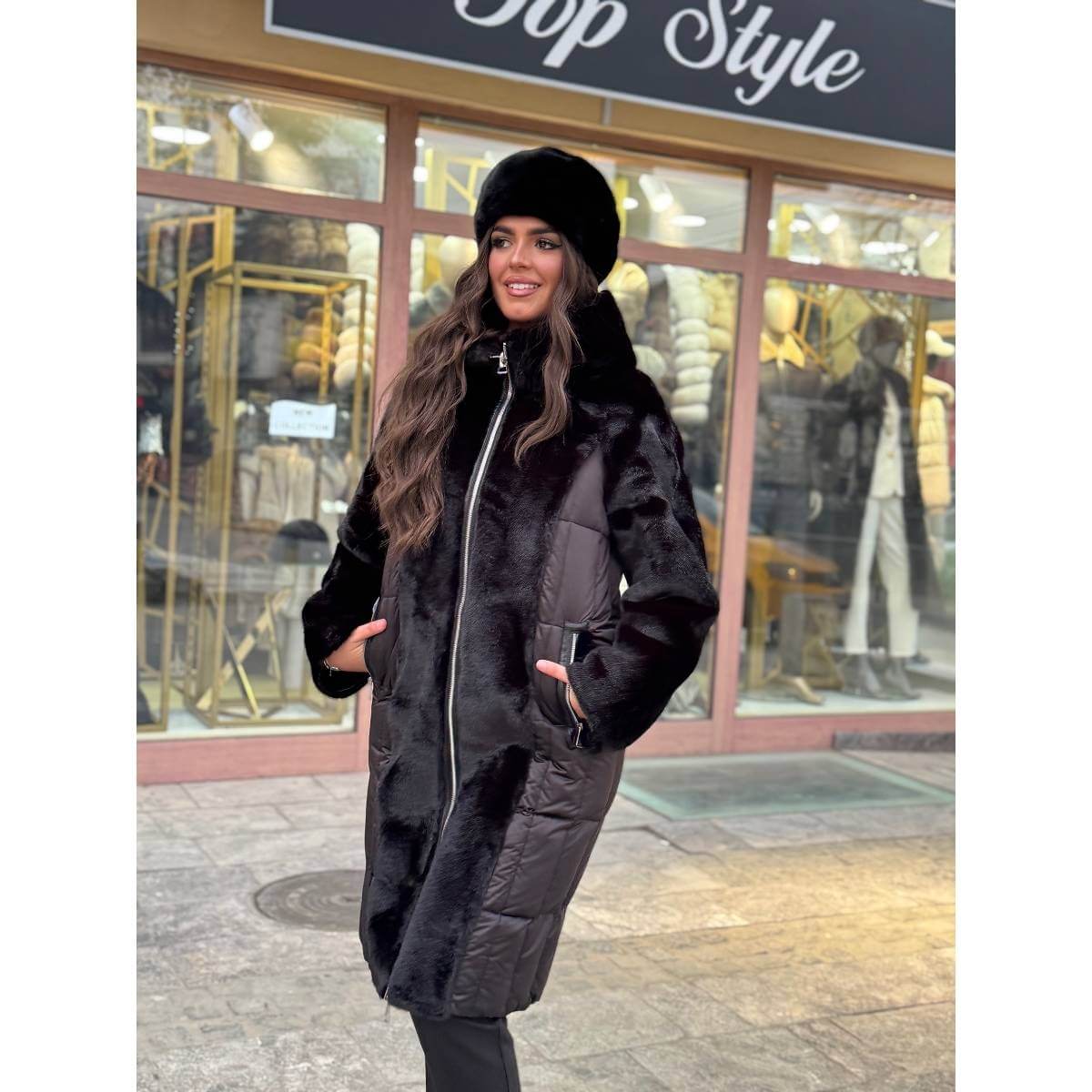 Elegantna duga jakna sa dva lica predstavlja savršen spoj luksuza, funkcionalnosti i modernog dizajna. Jedna strana jakne obogaćena je mekim krznenim detaljima koji daju sofisticiran i upečatljiv izgled, dok druga strana nudi jednostavniji, klasičan stil pogodan za svakodnevno nošenje.