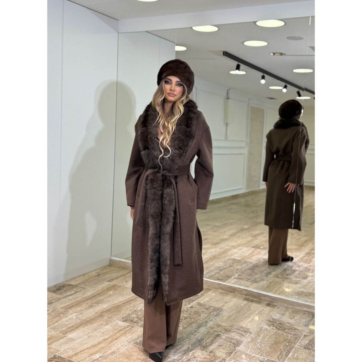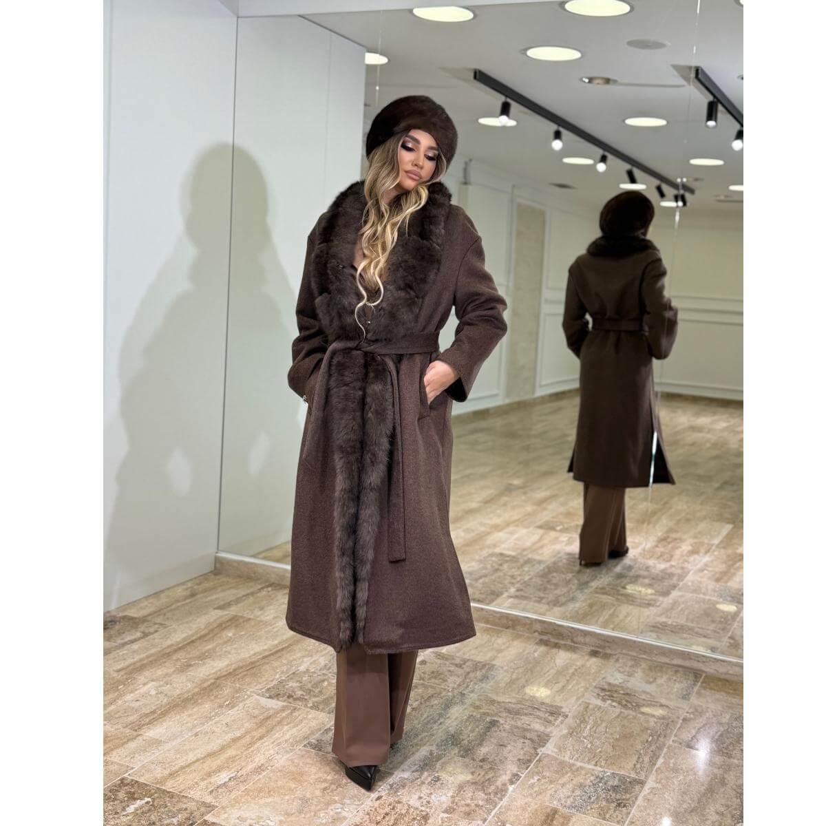 Dugi braon kaput sa prirodnim krznom i pojasom – Timeless Brown predstavlja savršen spoj klasične elegancije i luksuznih detalja. Izrađen od kvalitetnog materijala, ovaj kaput pruža toplinu i udobnost tokom hladnijih dana, dok prirodno krzno dodaje sofisticiran i upečatljiv izgled.