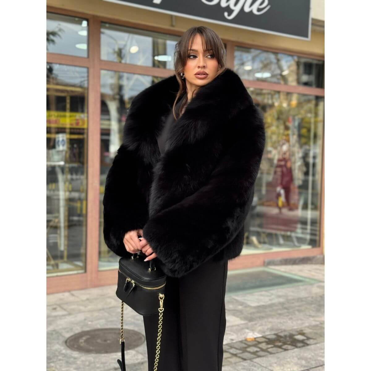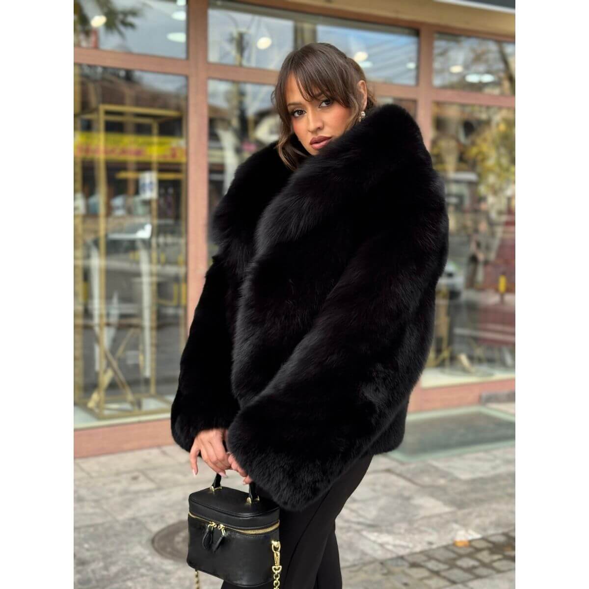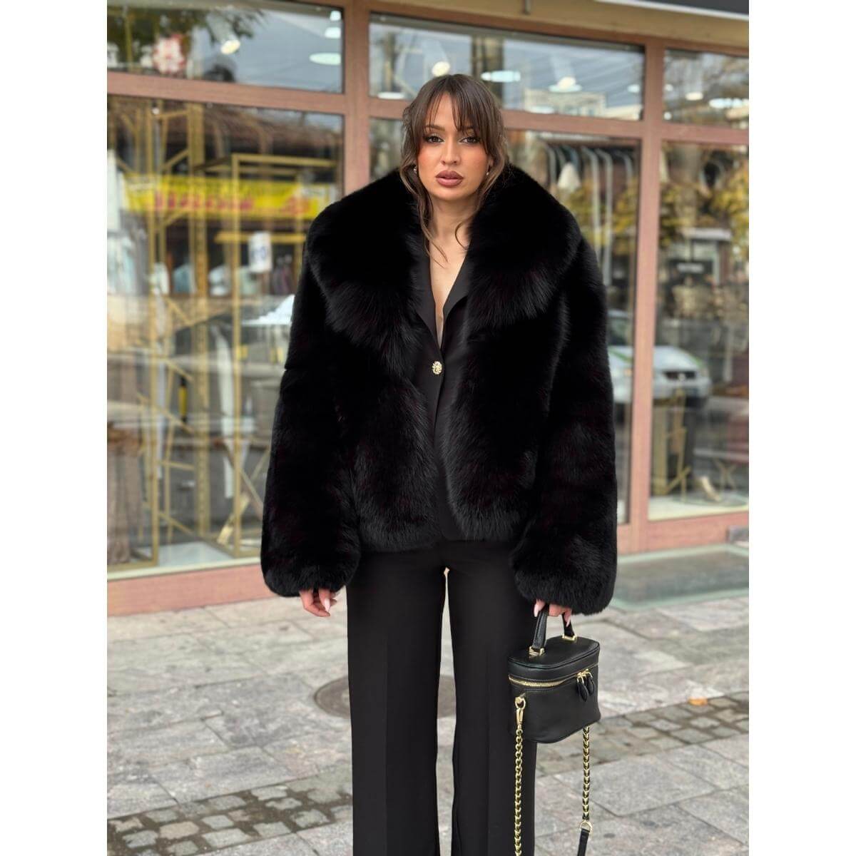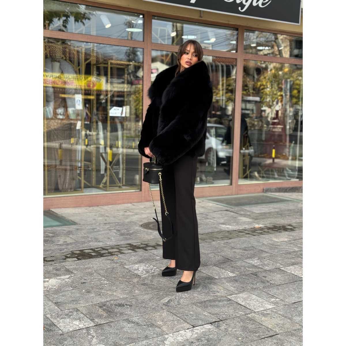 Kratak kroj daje ovoj bundi savremenu formu, dok široki reveri naglašavaju raskošan i glamurozan izgled. Duboka crna nijansa pojačava eleganciju i čini bundu idealnom za svečane prilike, večernje izlaske ili za dame koje žele da dodaju sofisticiran akcenat svojim zimskim kombinacijama.