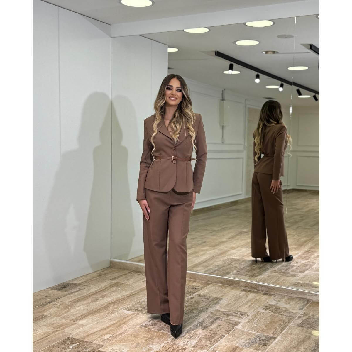 Komplet čini strukirani sako koji savršeno naglašava siluetu, dodatno istaknut tankim oker kaišićem — diskretnim, ali upečatljivim detaljem koji celom izgledu daje poseban šarm.