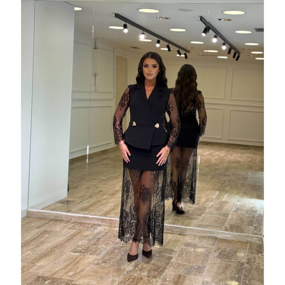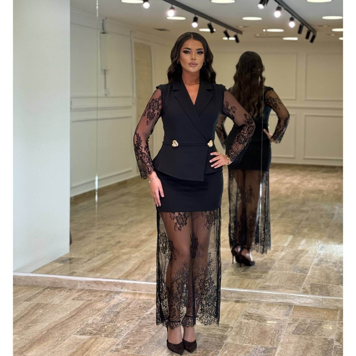 Elegantna crna haljina modernog dizajna, idealna za večernje i svečane prilike. Model je izrađen u pripijenom kroju koji naglašava siluetu, sa preklopnim V-izrezom i dekorativnim zlatnim dugmadima u predelu struka. Poseban akcenat daju dugi rukavi od prozirne čipke koji unose dozu luksuza i ženstvenosti, dok čipkasti detalji diskretno prate i donji deo haljine. Ova haljina je savršen izbor za koktele, proslave i formalne događaje.