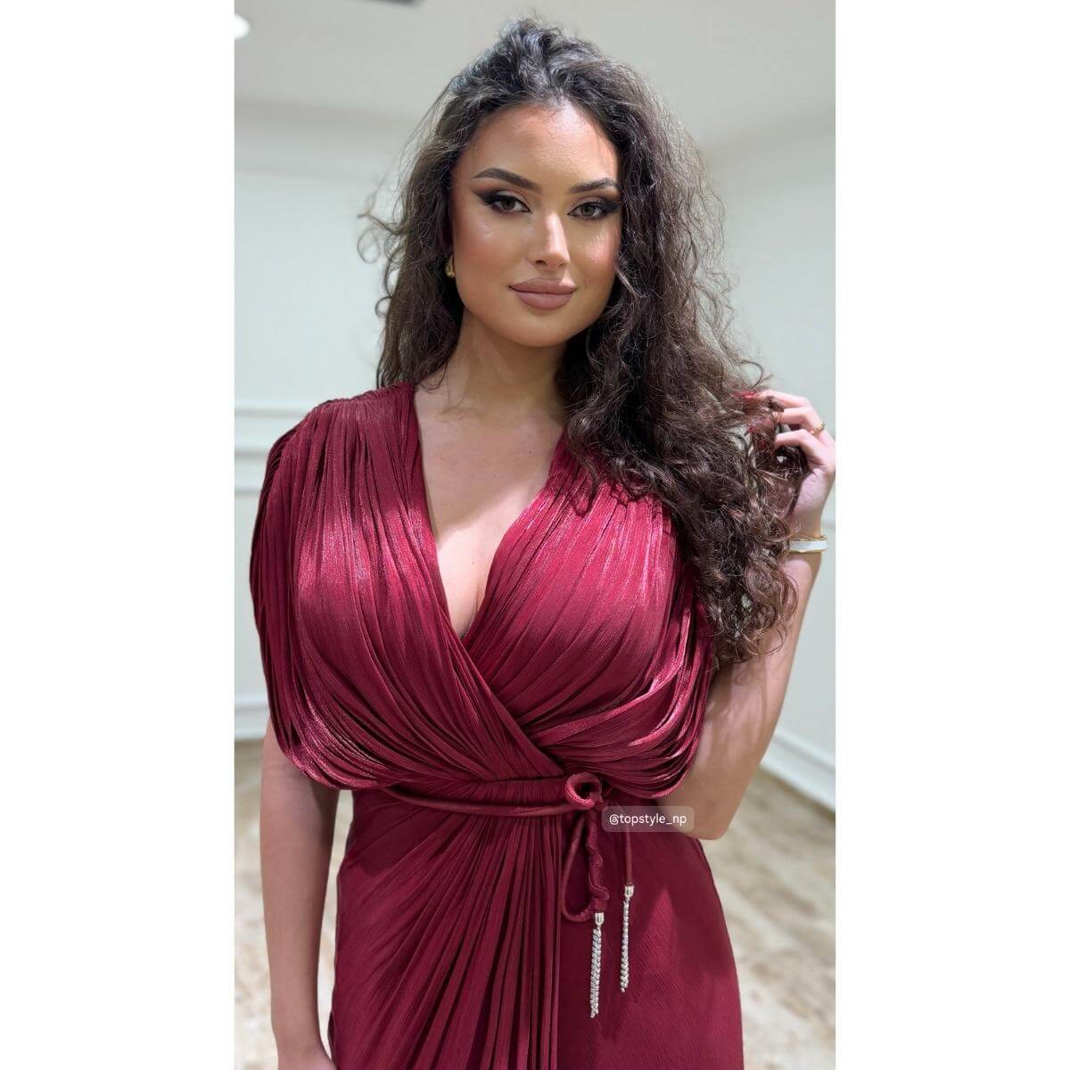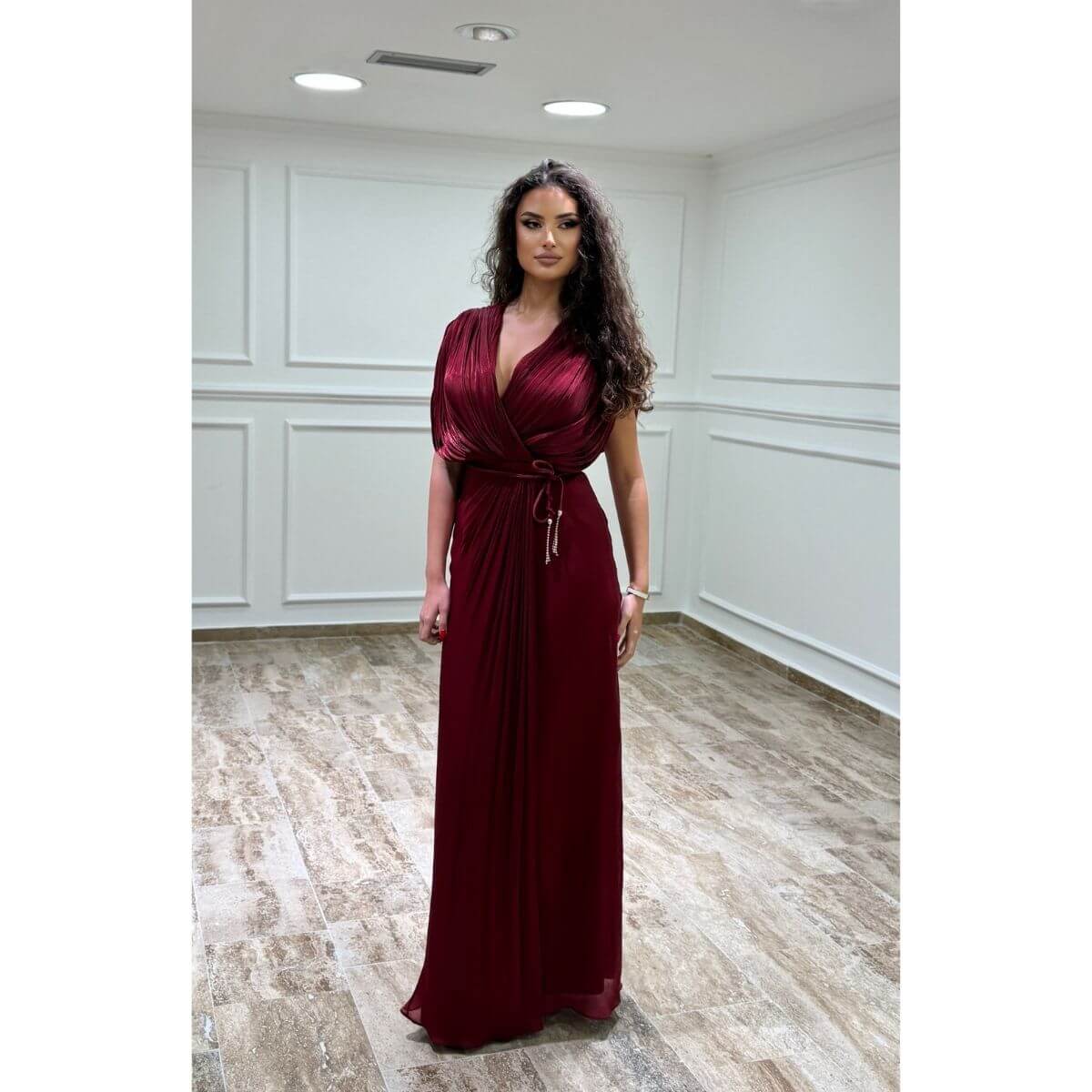 Elegantna duga haljina u dubokoj bordo nijansi, savršena za svečane prilike. Haljina ima ženstveni V-izrez i preklopni kroj koji lepo ističe figuru, dok lagano drapirana tkanina pada ravno i daje sofisticiran izgled. Struk je naglašen tankim pojasom sa diskretnim detaljem, a suknja je dužine do poda, što haljini daje dodatnu dozu elegancije. Idealna je za večernje događaje, svadbe, mature i formalne proslave.