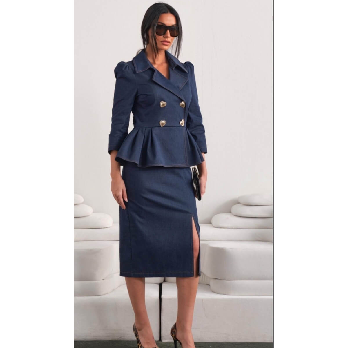 Ova sofisticirana teksas haljina predstavlja savršen spoj elegancije i modernog poslovnog stila. Gornji deo je krojen u stilu sakoa sa duplim kopčanjem i dekorativnim zlatnim dugmadima koji daju notu luksuza. Struk je naglašen peplum krojem koji ističe siluetu i dodaje ženstvenost celokupnom izgledu.