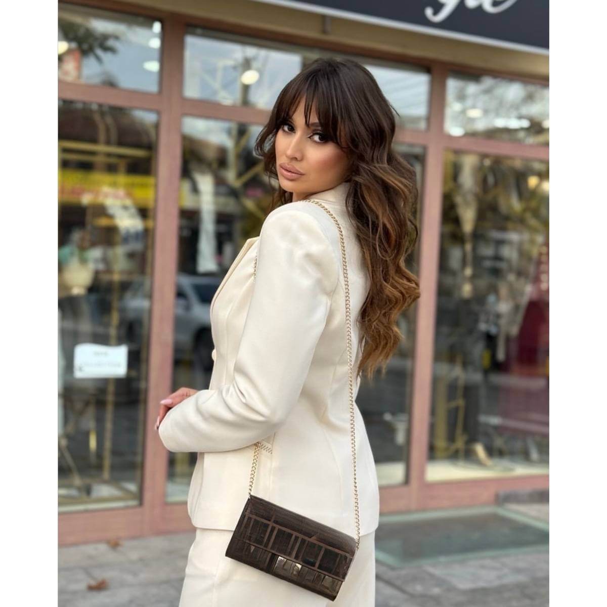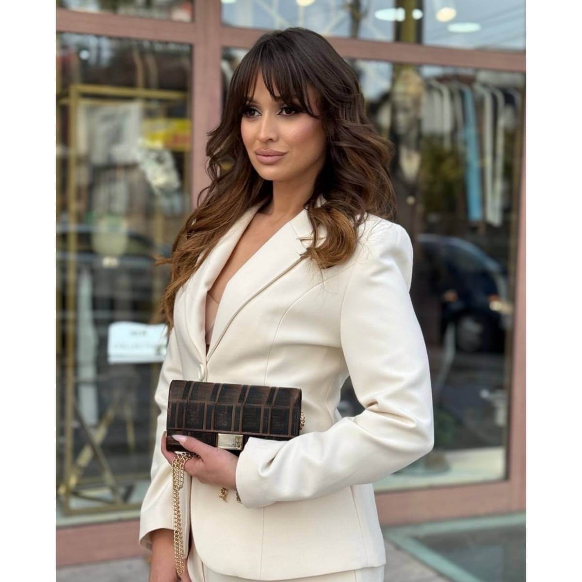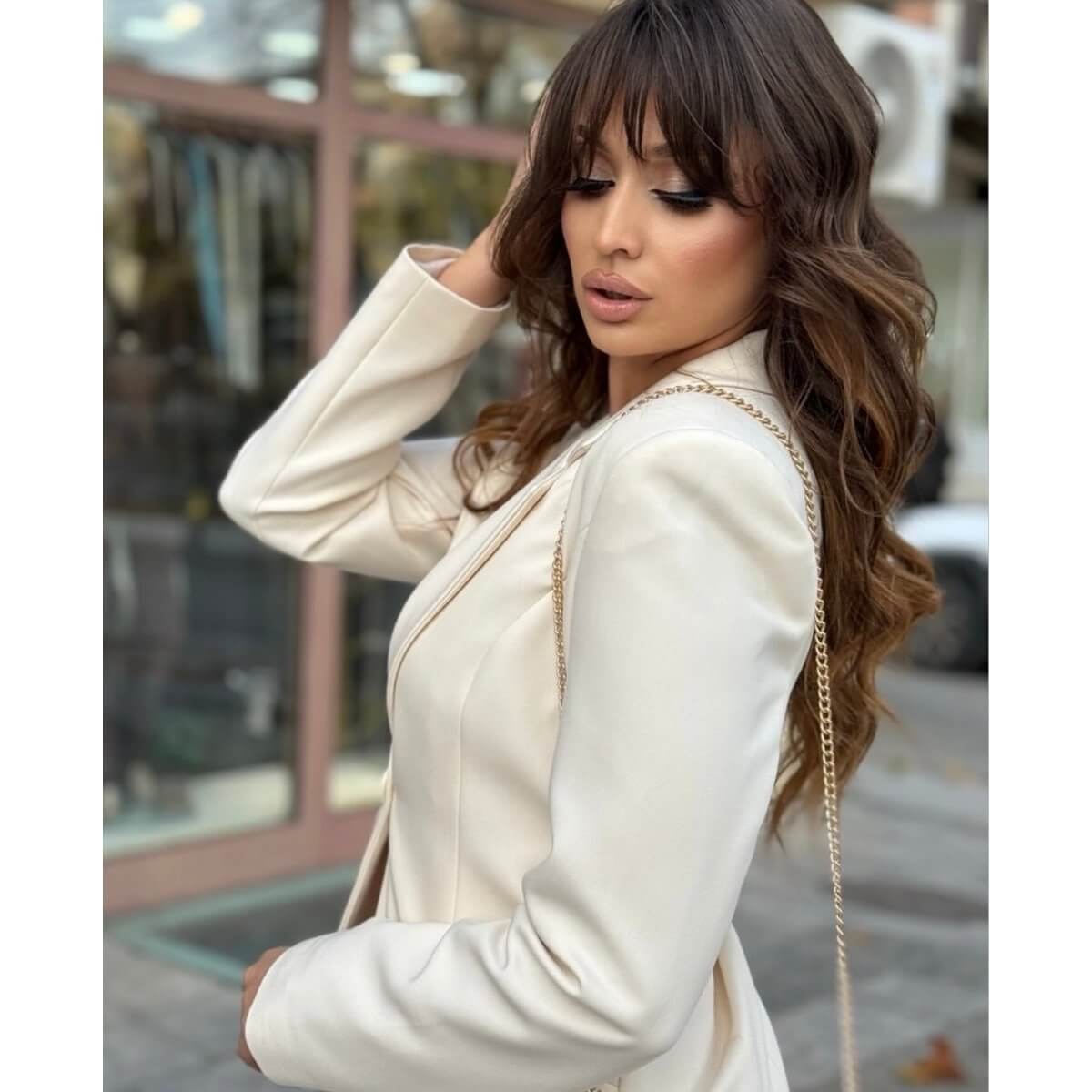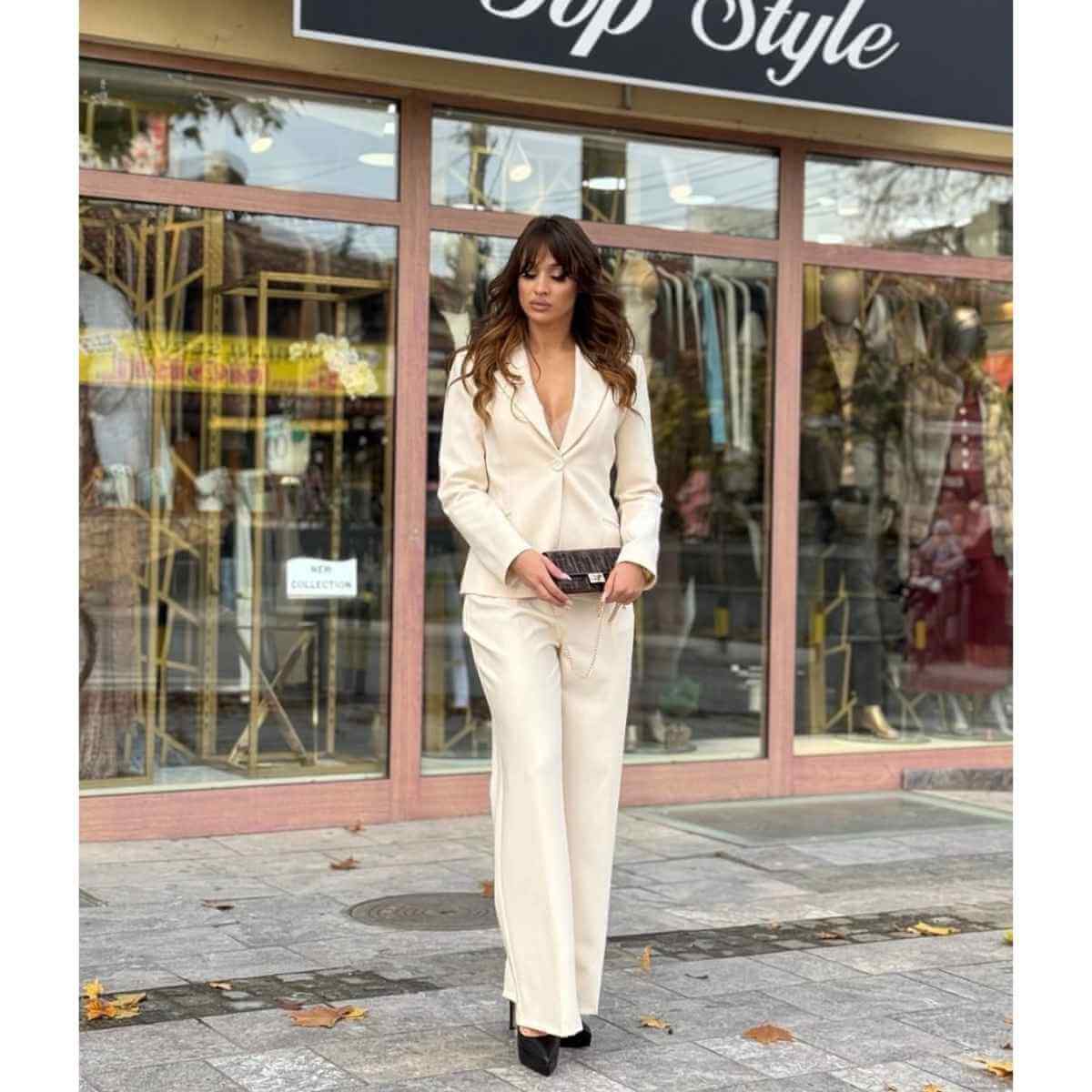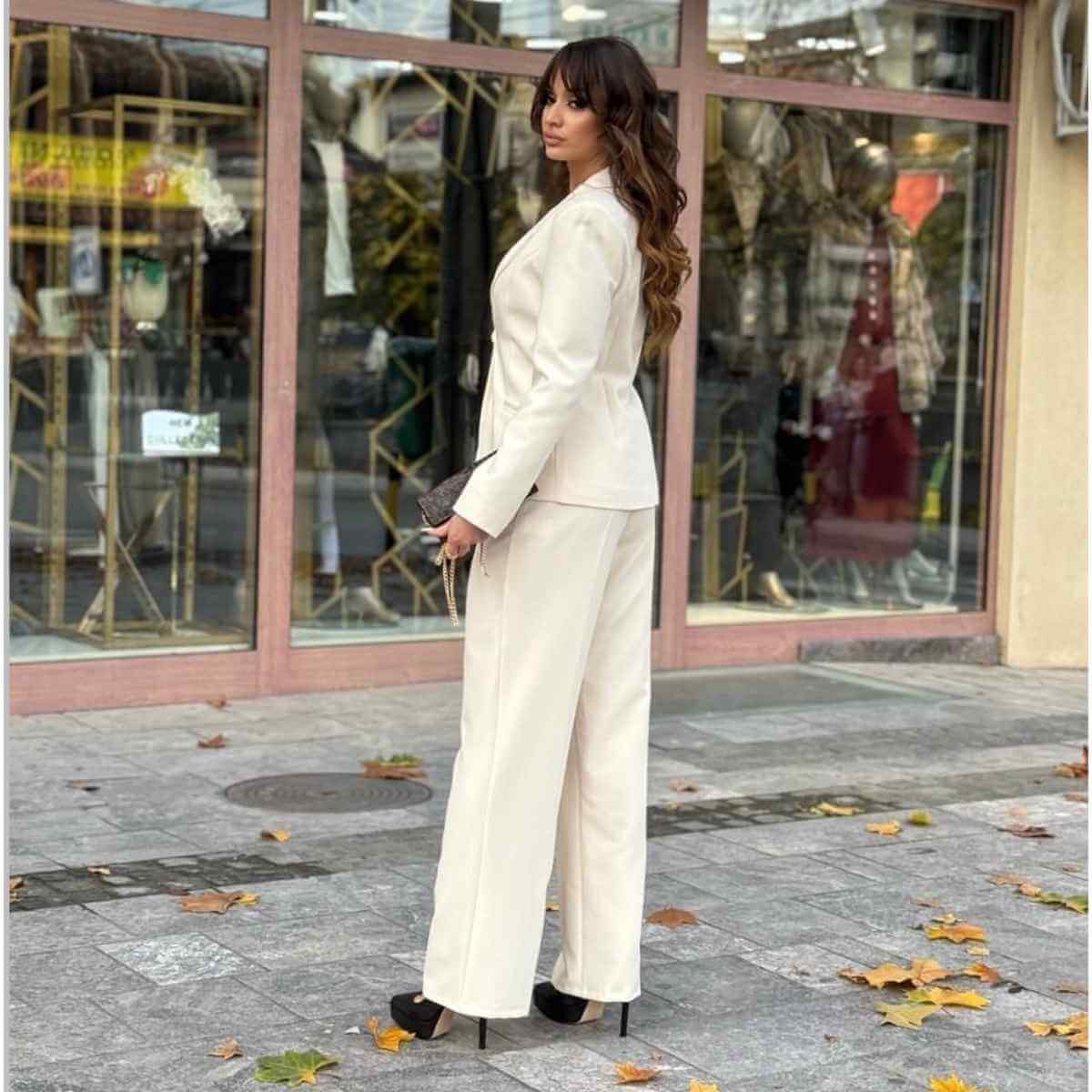 Ovaj sofisticirani komplet sa sakoom i pantalonama predstavlja savršen spoj elegancije i modernog poslovnog stila. Sako je strukiranog kroja, sa klasičnim reverima i diskretnim kopčanjem koje naglašava siluetu i daje ženstven, ali autoritativan izgled.
