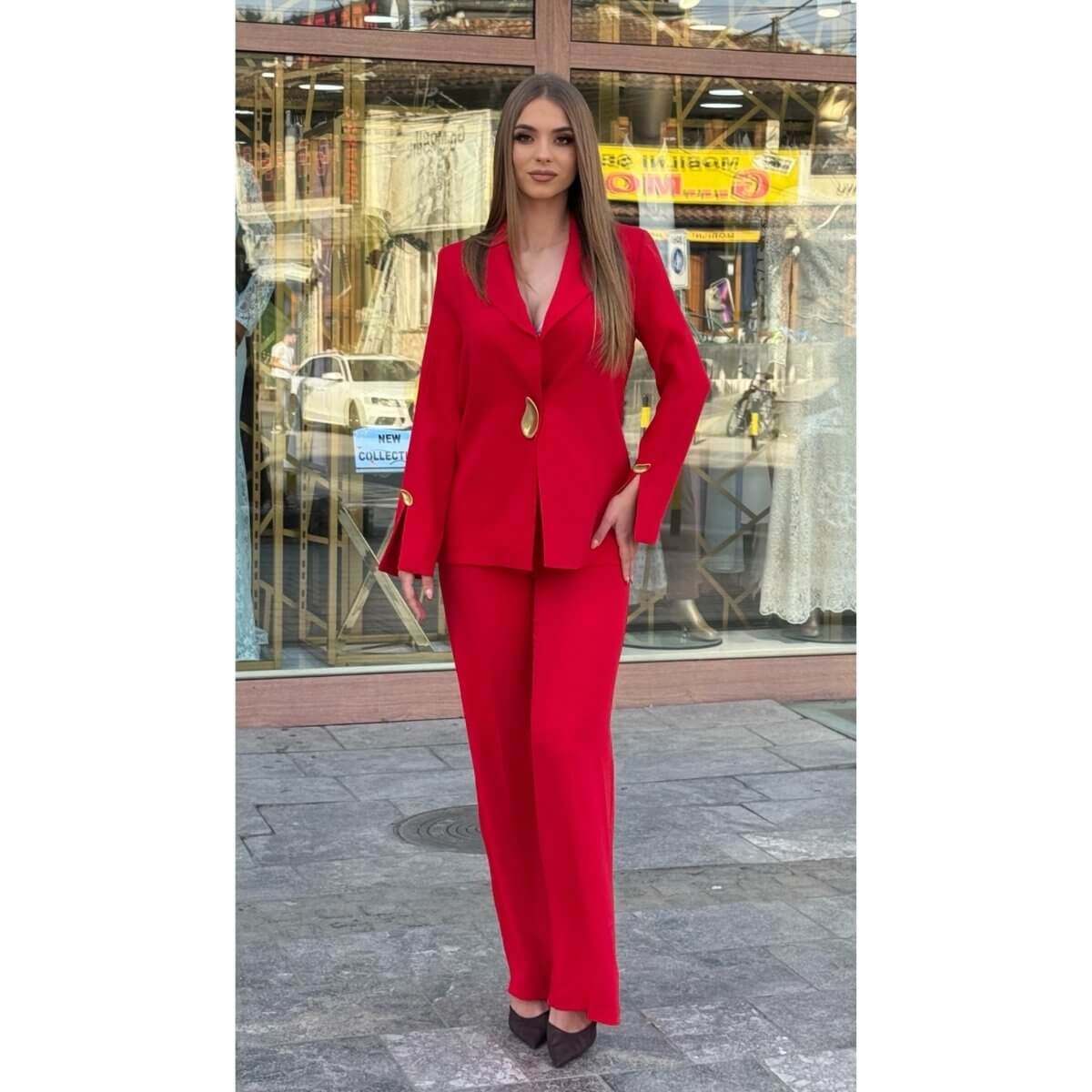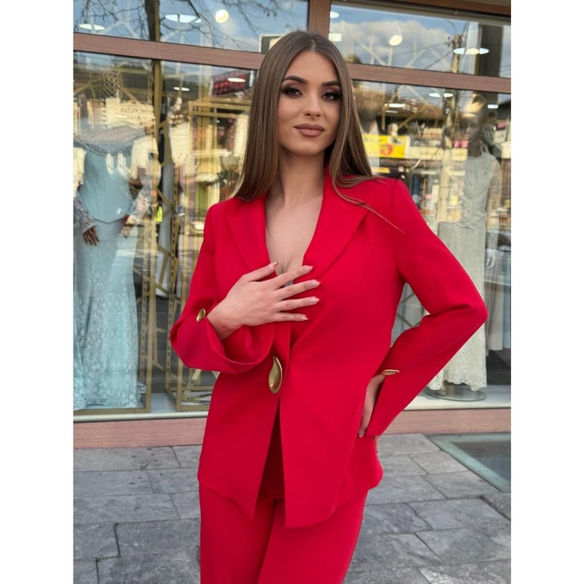 Istaknite svoj stil i samopouzdanje uz ovaj upečatljivi crveni ženski komplet koji kombinuje eleganciju i moderni dizajn. Sako je strukiran i savršeno prati liniju tijela, dok ga posebni zlatni detalji na kopčanju i rukavima čine luksuznim i jedinstvenim.