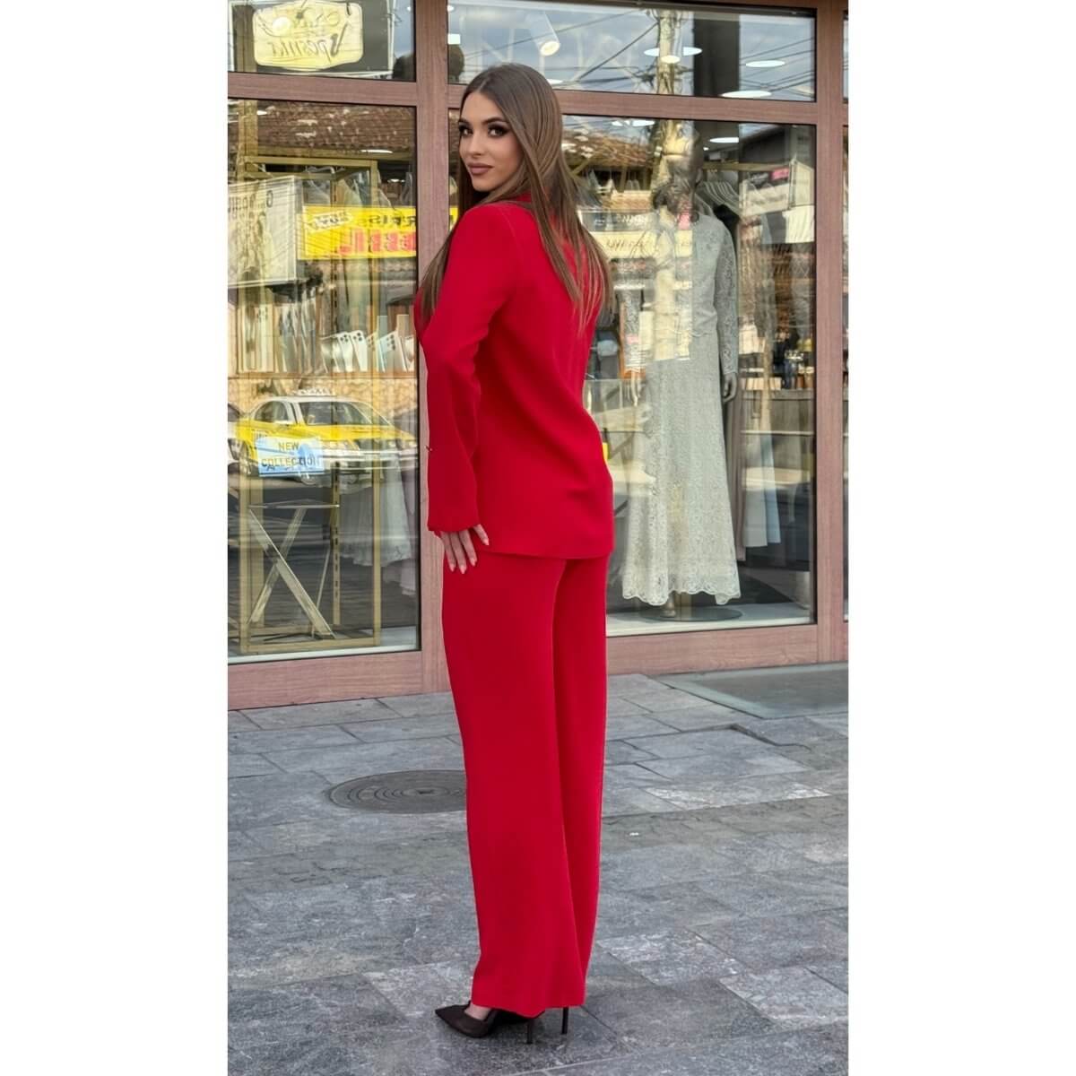 Pantalone ravnog kroja dodatno izdužuju figuru i pružaju maksimalnu udobnost, čineći ovaj komplet idealnim izborom za poslovne prilike, večernje izlaske ili svečane događaje. Intenzivna crvena boja simbolizuje samopouzdanje i snagu, pa je ovaj outfit savršen za žene koje žele ostaviti snažan utisak.