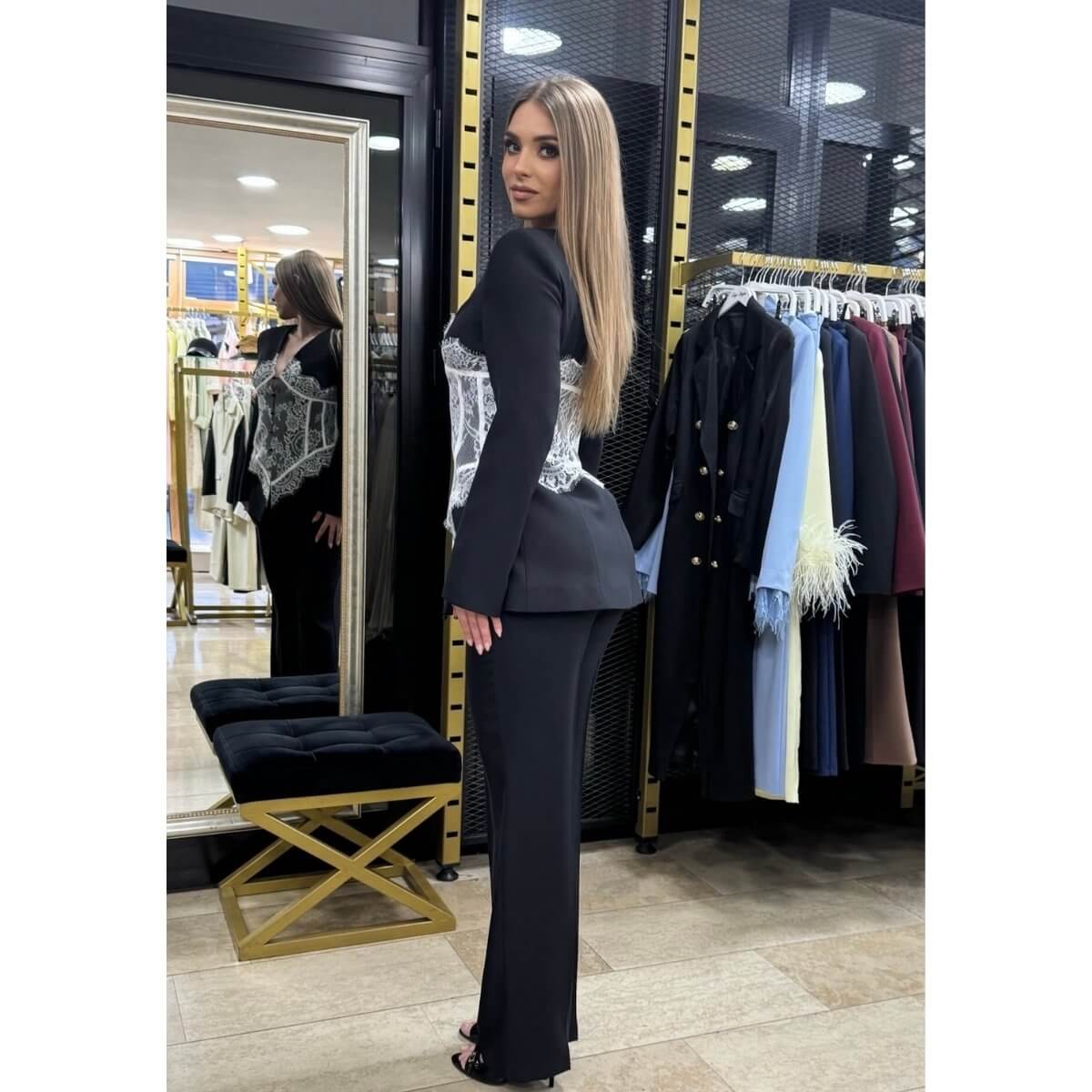 Ovaj upečatljivi komplet donosi savršen balans elegancije i senzualnosti, sa čipkom kao glavnim detaljem koji dominira celokupnim izgledom. Raskošna, bogato izrađena čipka na prednjem delu daje efekt luksuza i privlači pažnju, dok klasično krojeni sako i pantalone ravne linije naglašavaju figuru i pružaju sofisticiran izgled. Savršen izbor za večernje prilike, svečane događaje ili kada želite da ostavite snažan i elegantan utisak. Dostupan je u više boja, što ga čini još praktičnijim za različite stilove i ukuse.