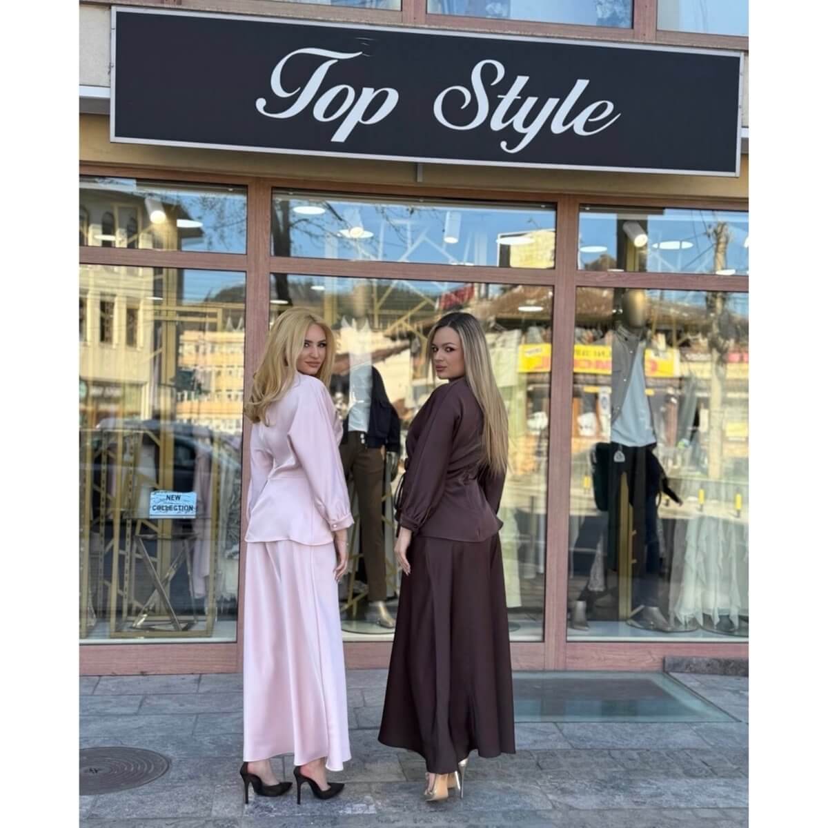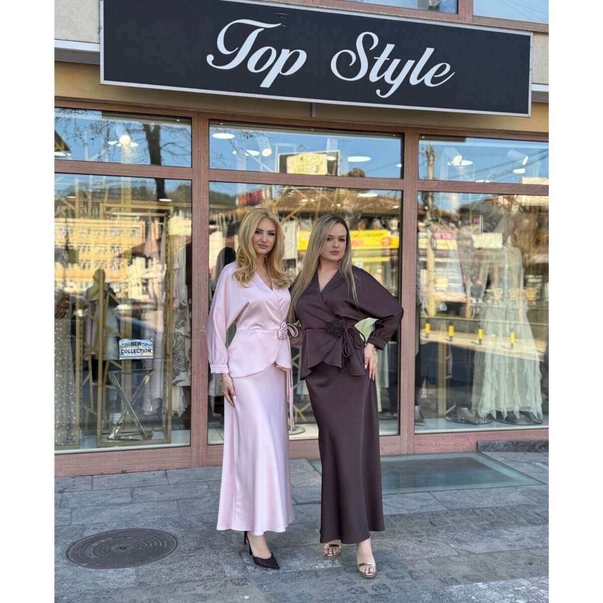 Duga, lepršava suknja prati liniju tijela i pruža udobnost pri svakom koraku, čineći ovaj komplet idealnim izborom za svečane prilike, večernje izlaske ili posebne događaje. Sjajni satin materijal daje luksuzan izgled i dodatno ističe cjelokupan outfit.