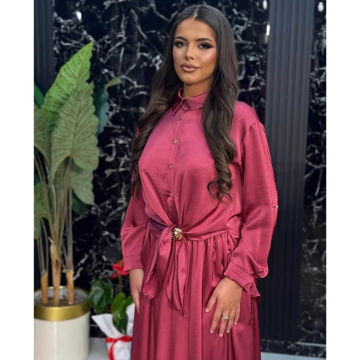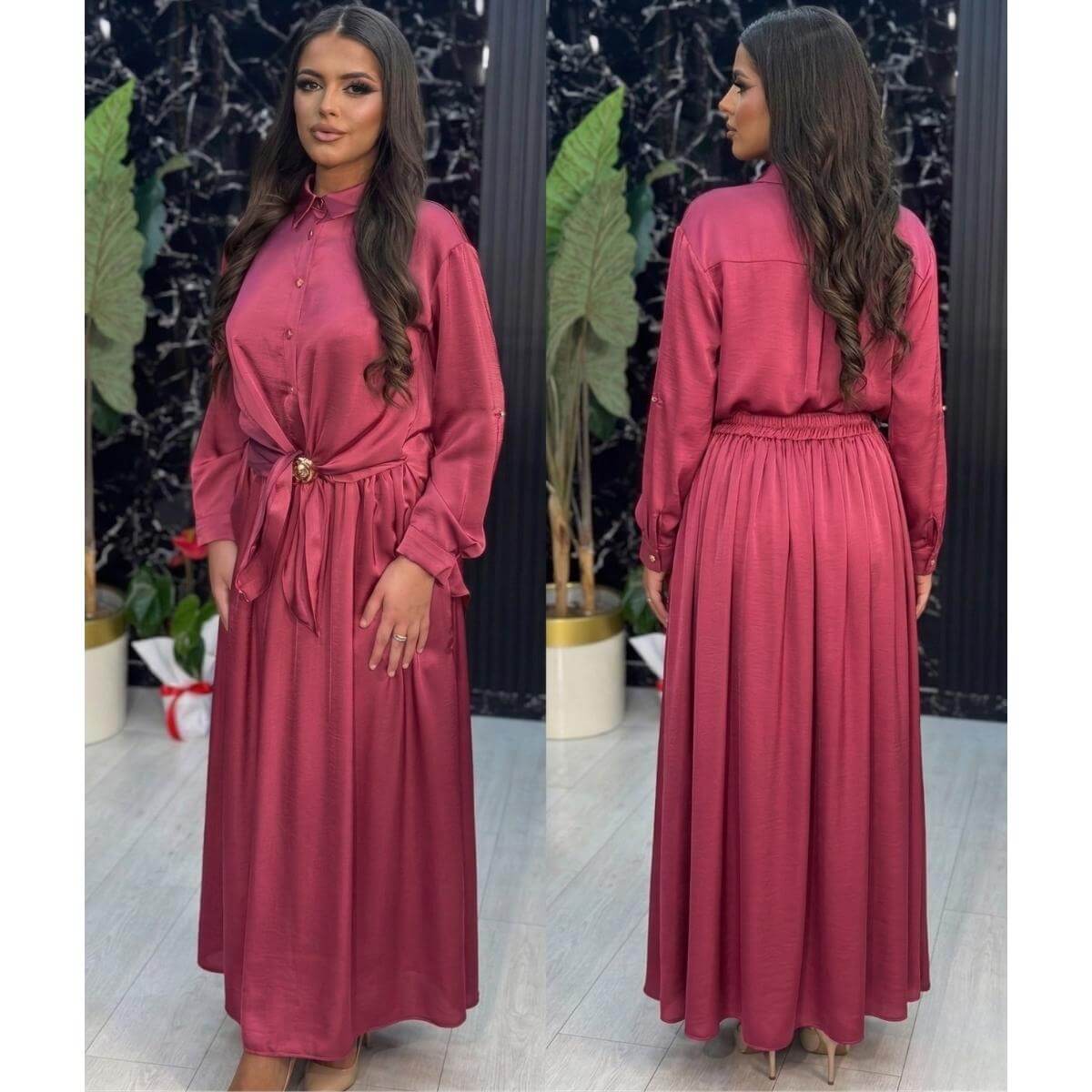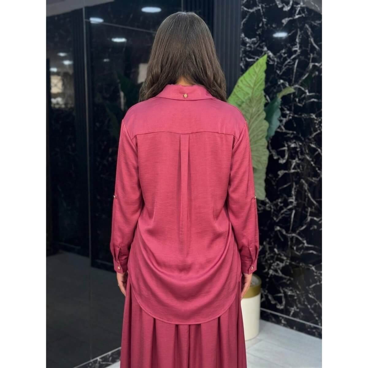 Ovaj prefinjeni dvodelni komplet, izrađen od visokokvalitetnog satena u bogatoj nijansi trula višnja, predstavlja savršen spoj elegancije i udobnosti. Komplet se sastoji od košulje dugih rukava sa kragnom i duge, lepršave suknje.