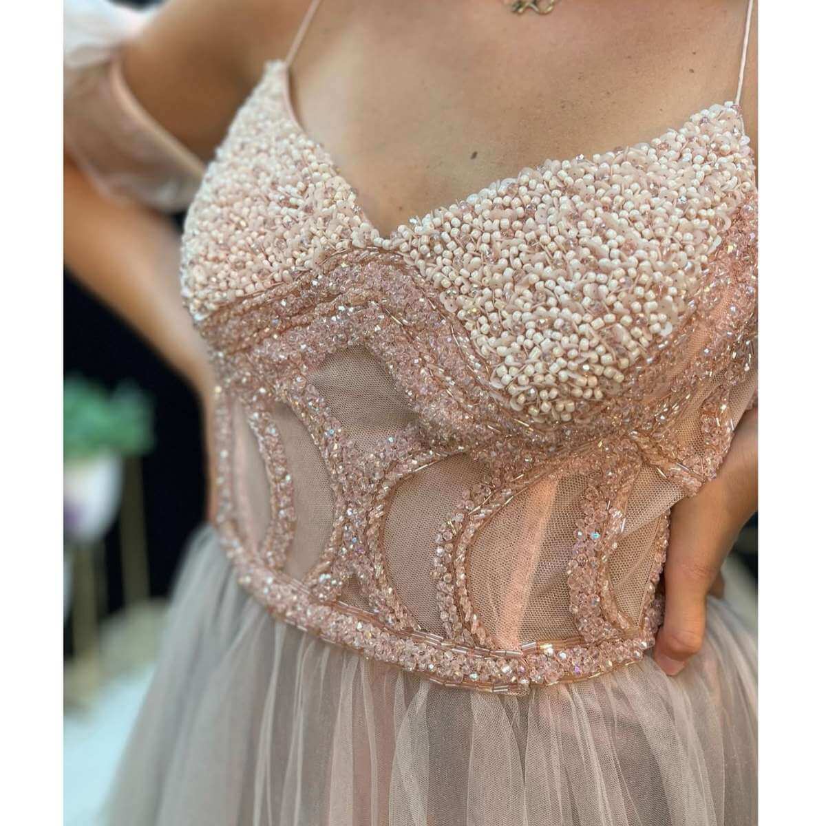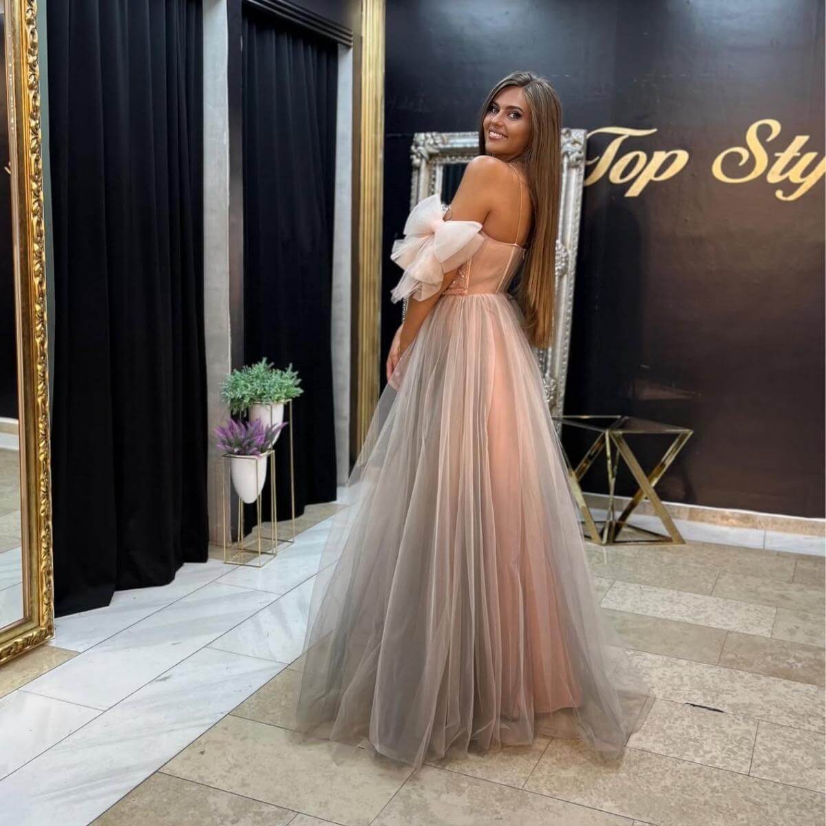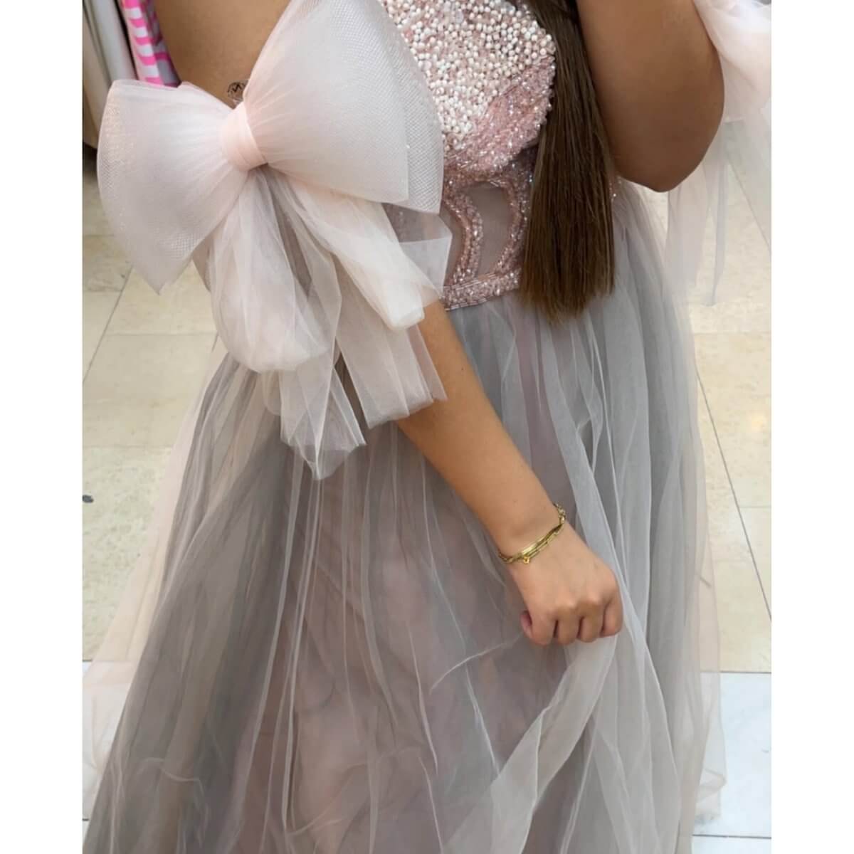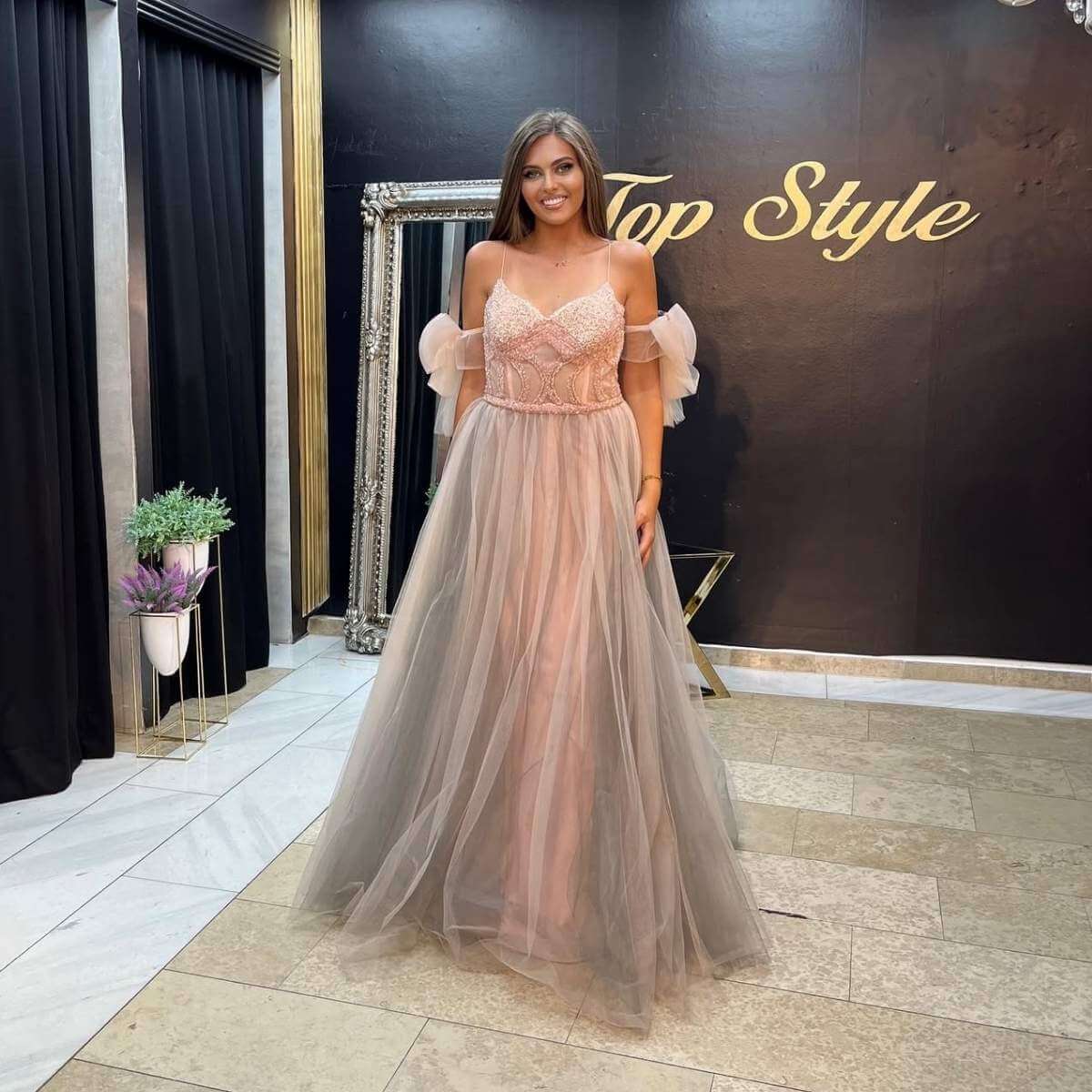 Ova duga haljina u bledo roze nijansi odiše nežnošću i elegancijom. Gornji deo krasi ručno ukrašeni korset na tankim bretelama, koji ističe siluetu i daje poseban, luksuzan karakter modelu. Donji deo izrađen je od slojevitog tila koji haljini daje lepršavost i romantičan pad. Kao poseban detalj, oko ruku iznad lakata nalaze se dekorativne mašne od tila, koje dodatno naglašavaju ženstvenost i jedinstven dizajn. Savršen izbor za svečane prilike, maturske večeri, gala događaje i posebne trenutke.