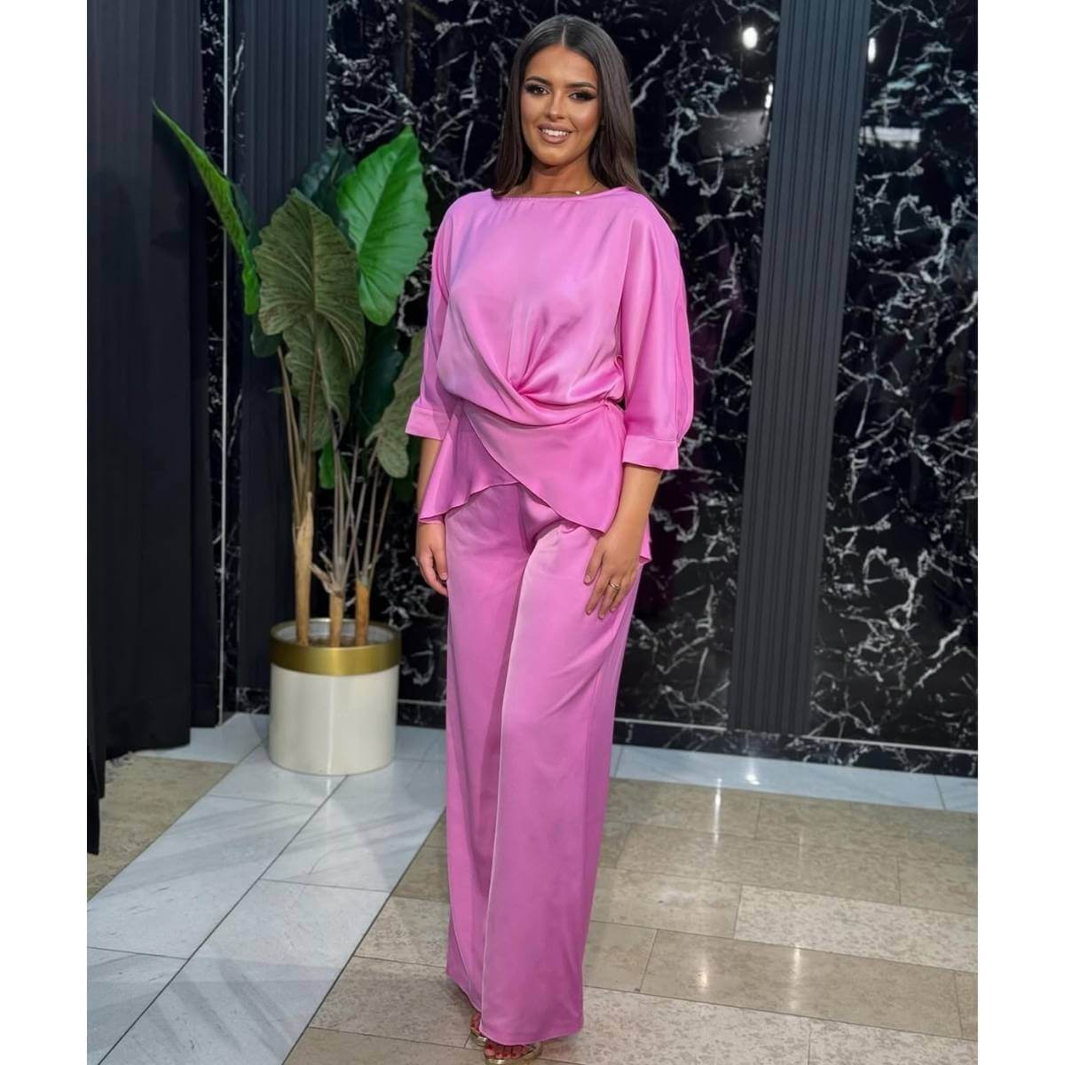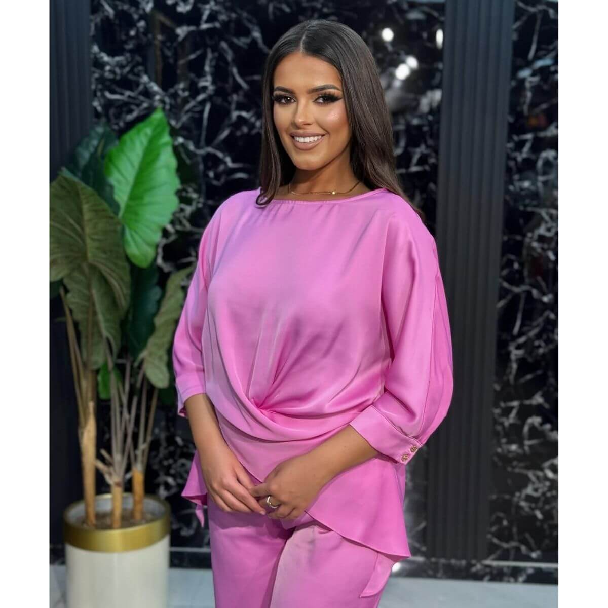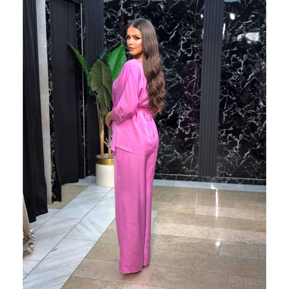 Lagani komplet koji čine košulja sa vezivanjem i pantalone savršen je izbor za udoban, a istovremeno moderan izgled. Košulja sa vezivanjem omogućava prilagođavanje silueti i dodaje ženstvenu notu, dok lagane pantalone pružaju maksimalnu udobnost i slobodu pokreta. Ovaj komplet je idealan za svakodnevne ili posebne prilike, nudeći spoj praktičnosti i stila.