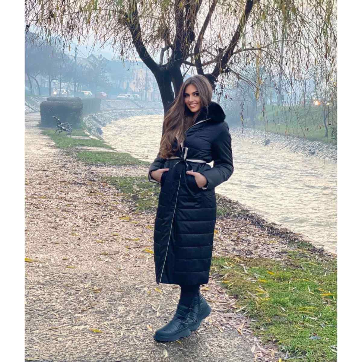 Ova jakna ima urbani kroj koji lepo prati liniju tela, a pojas u struku dodatno naglašava figuru i daje ženstven izgled. Kragna od luksuznog prirodnog krzna lisice pruža sofisticiran izgled i dodatnu zaštitu od hladnoće.