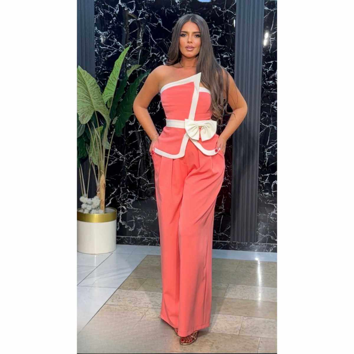 Moderan i ženstven komplet koji se sastoji od elegantnog topa bez rukava i širokih pantalona sa visokim strukom. Top je asimetričnog kroja, naglašen kontrastnim ivicama i dekorativnom mašnom u predelu struka, koja dodatno ističe siluetu. Pantalone ravnog, lepršavog kroja pružaju udobnost i vizuelno izdužuju figuru.