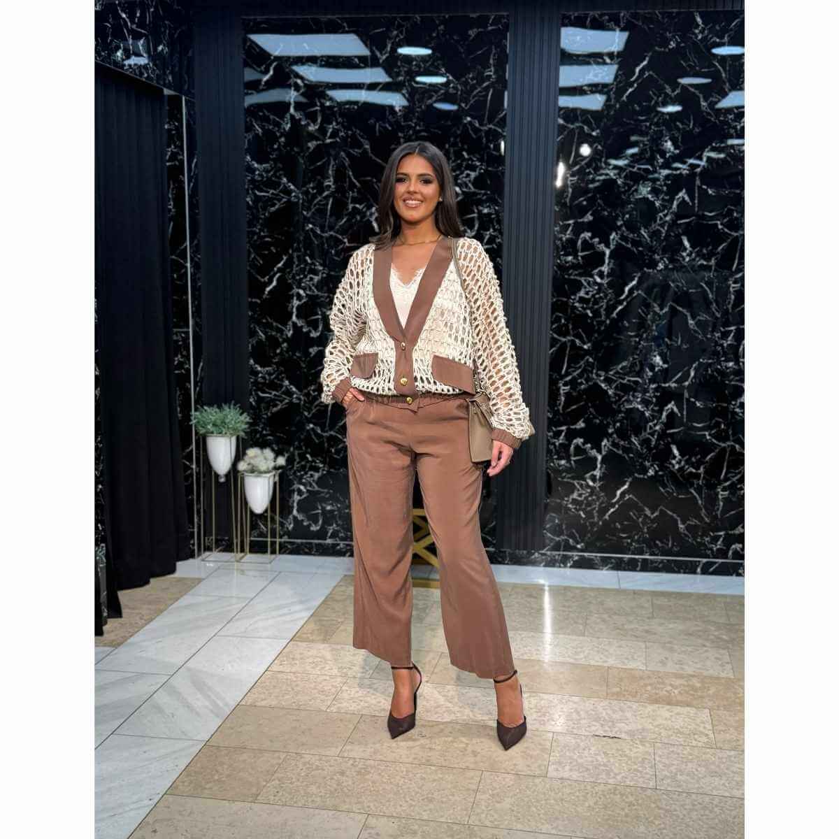 Ovaj braon komplet odiše prirodnom elegancijom, casual chic stilom i savršen je za prelazne sezone ili za urbani izgled. Kombinacija tople braon nijanse sa krem detaljima – inspirisano zemljanim tonovima. Mrežasta struktura u bež boji sa kontrastnim braon oivičenjem i zlatnim dugmadima – neobična i trendi tekstura. Rukavi su lagani i prozračni, što dodaje slojevitost. Ravne pantalone sa laganim sjajem i cropped dužinom – moderan i udoban kroj koji pruža ležernost uz eleganciju.