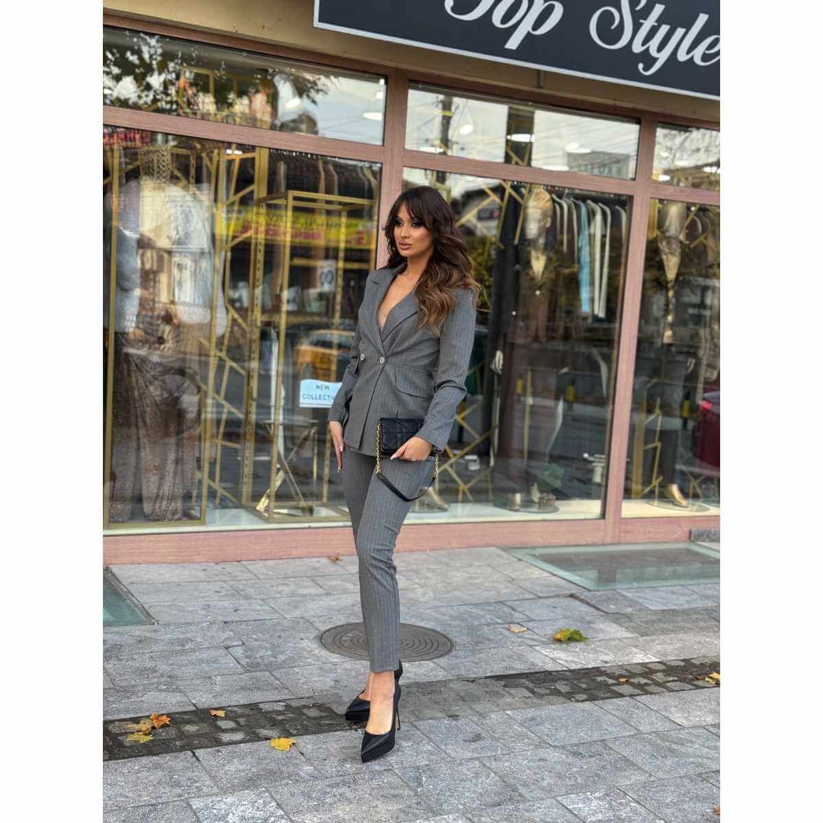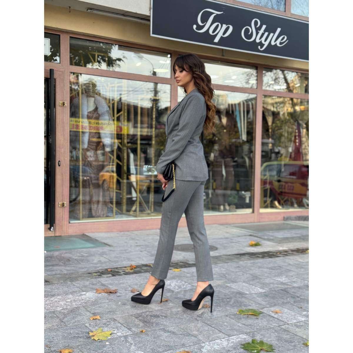 Komplet čine strukirani sako sa atraktivnim izrezima napred, koji ističe figuru i dodaje dozu elegancije, i uske cigaret pantalone koje savršeno prate liniju tela.