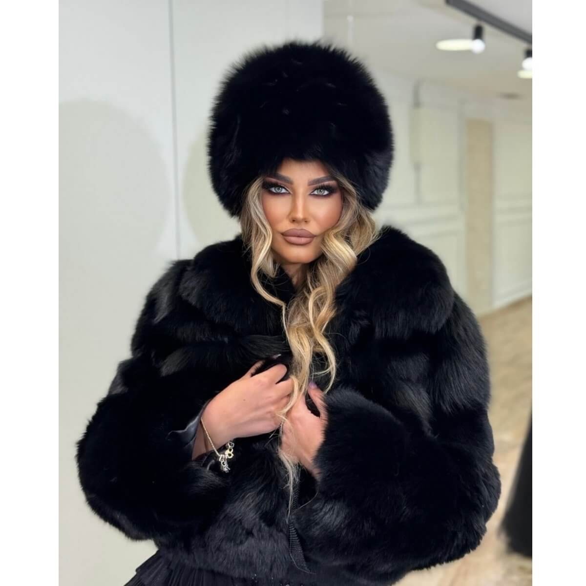 Bunda je obogaćena elegantnom kragnicom, koja dodatno ističe raskoš i punoću krzna, pružajući toplinu i sofisticiran izgled tokom hladnih dana. Mekana tekstura i prirodan sjaj lisice čine ovaj komad izuzetno luksuznim, dok klasičan kroj garantuje dugovečnost u garderobi.
