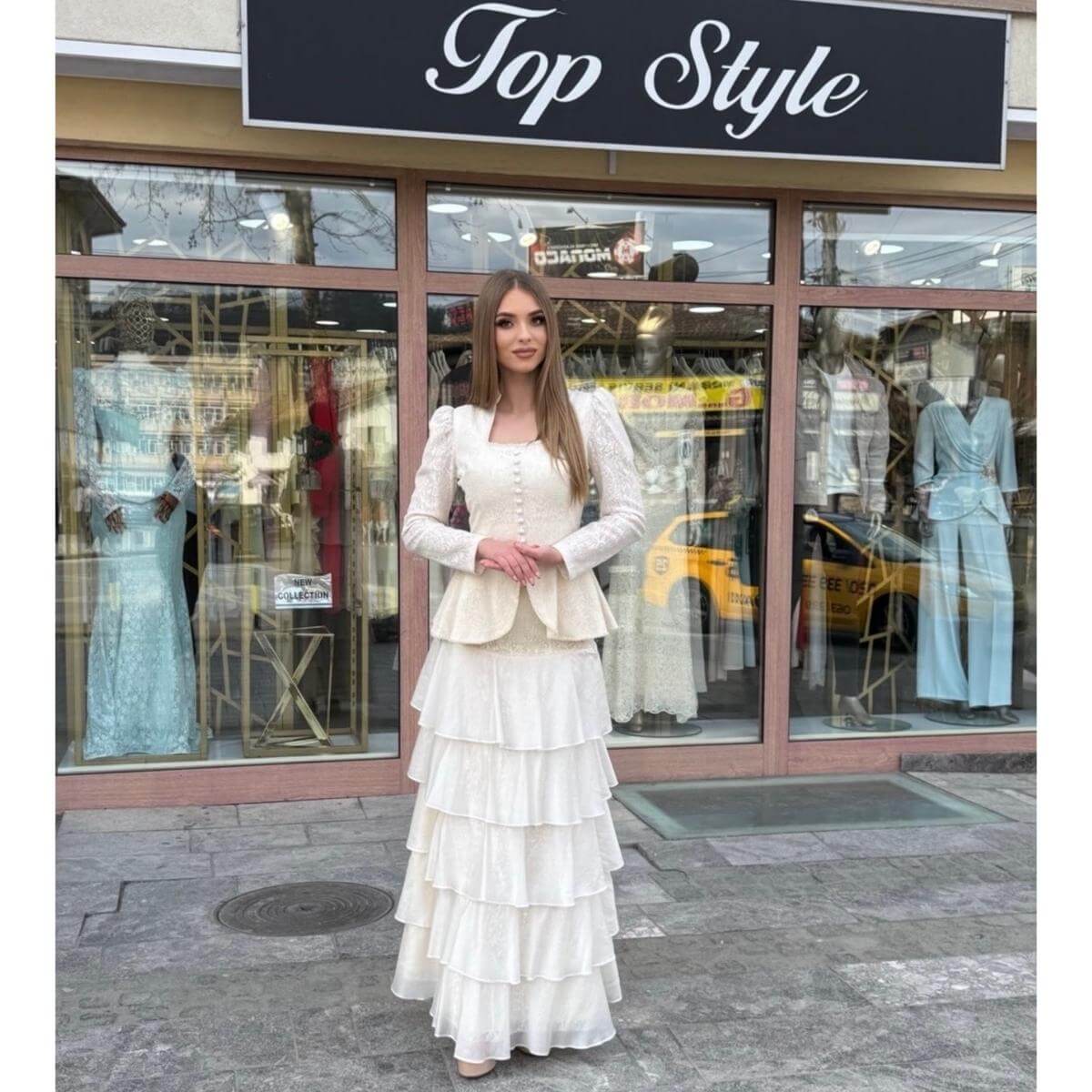 Maksi suknja sa slojevitim riševima donosi dozu romantike i lakoće, stvarajući lepršav i luksuzan efekat pri svakom koraku. Ovaj komplet je idealan za venčanja, proslave, krštenja ili elegantne večernje događaje.