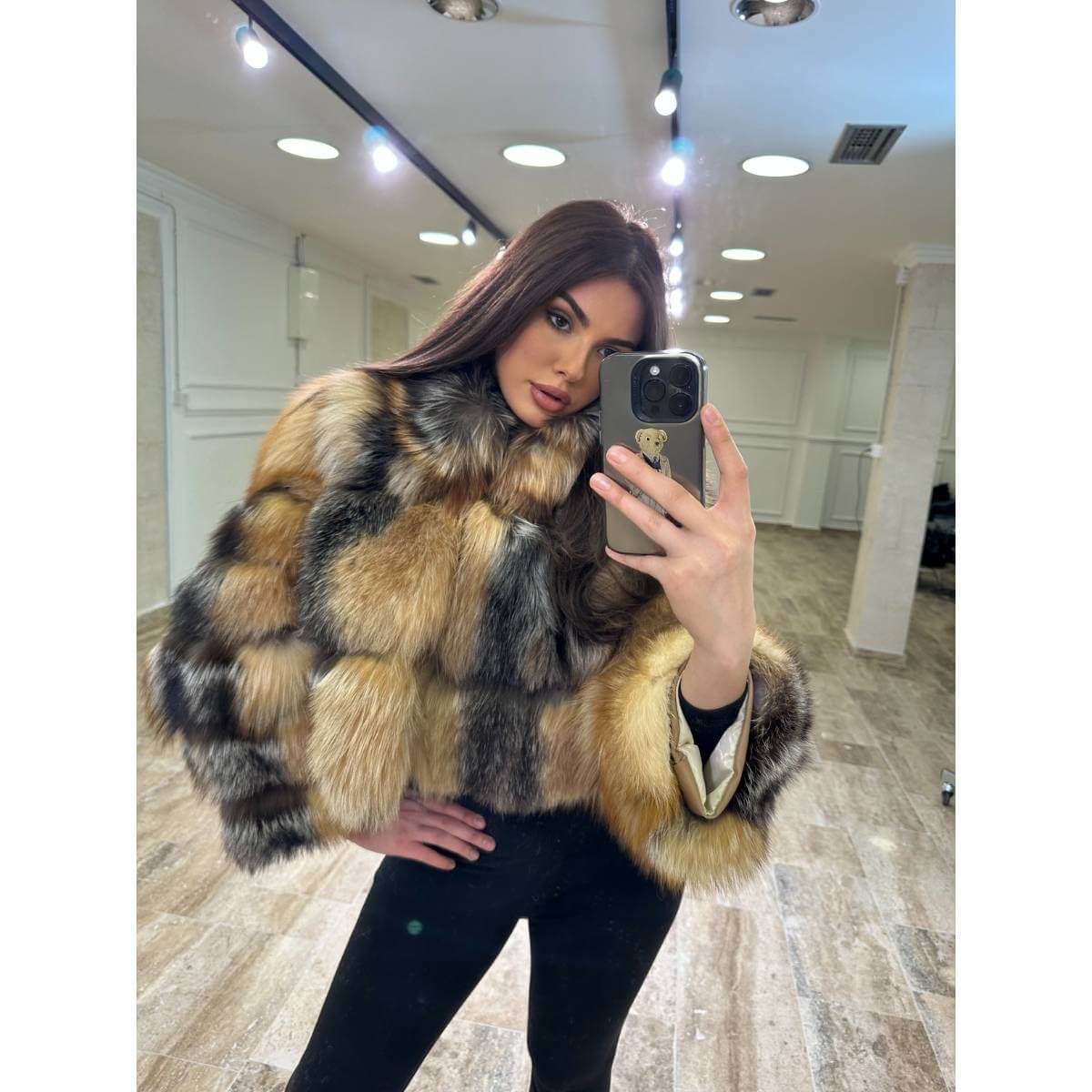 Elegantna ženska bunda srednje dužine izrađena od prirodnog krzna, koja se ističe bogatom teksturom i sofisticiranim prelazima prirodnih nijansi smeđe, zlatne i tamnosive boje. Klasičan kroj pruža bezvremensku eleganciju, dok gusto i mekano krzno osigurava izuzetnu toplinu i udobnost tokom zimskih dana. Bunda ima uredno oblikovanu kragnu i završetke rukava od punog krzna, što dodatno naglašava luksuzan izgled. Idealna je za svečane prilike, večernje izlaske, ali i za upečatljive dnevne kombinacije u hladnijem periodu.