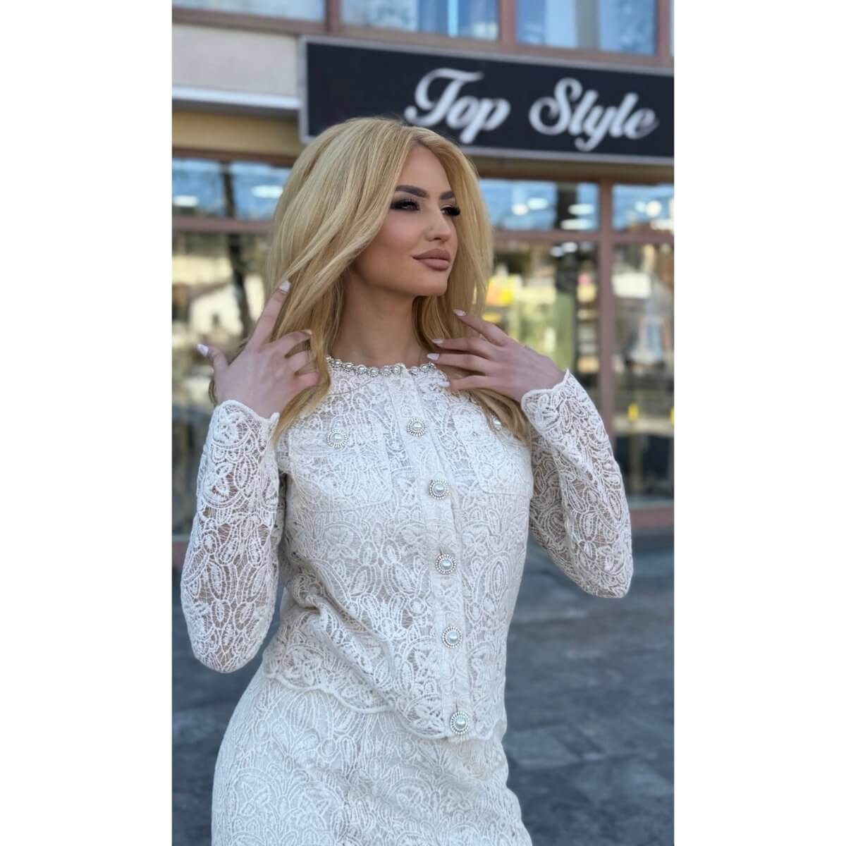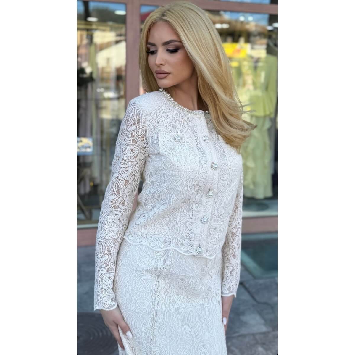 Blejzer od čipke: Prefinjeni gornji deo sa dugim rukavima i diskretnim kopčanjem. Ukrašen je bogatim radom i detaljima od bisera oko vrata, što mu daje luksuzan završni pečat.
