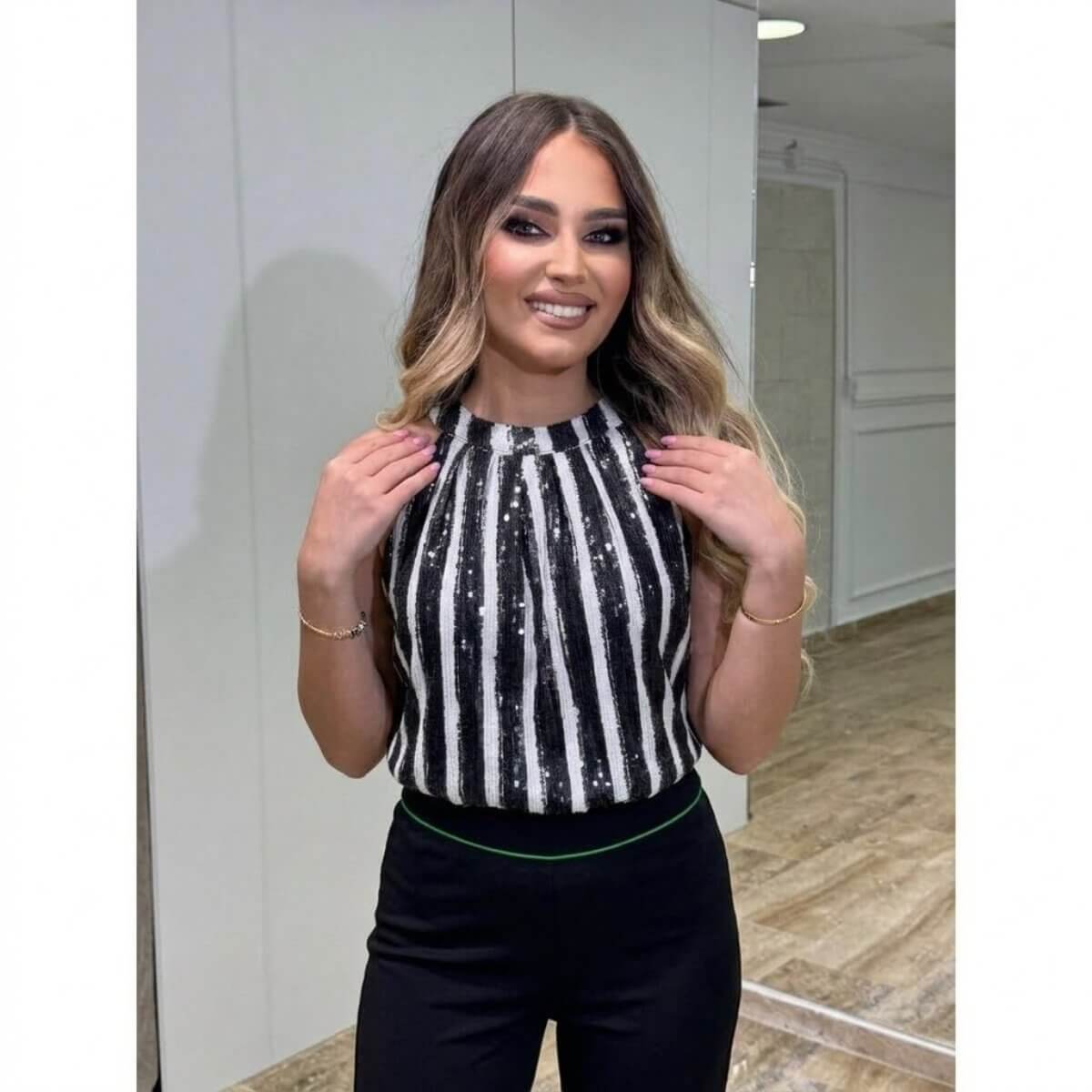 Noir Chic komplet predstavlja savršenu kombinaciju elegancije i modernog dizajna. Gornji deo bez rukava, sa efektim vertikalnim crno-belim prugama i paricama sa diskretnim sjajem, vizuelno izdužuje figuru i daje sofisticiran izgled.