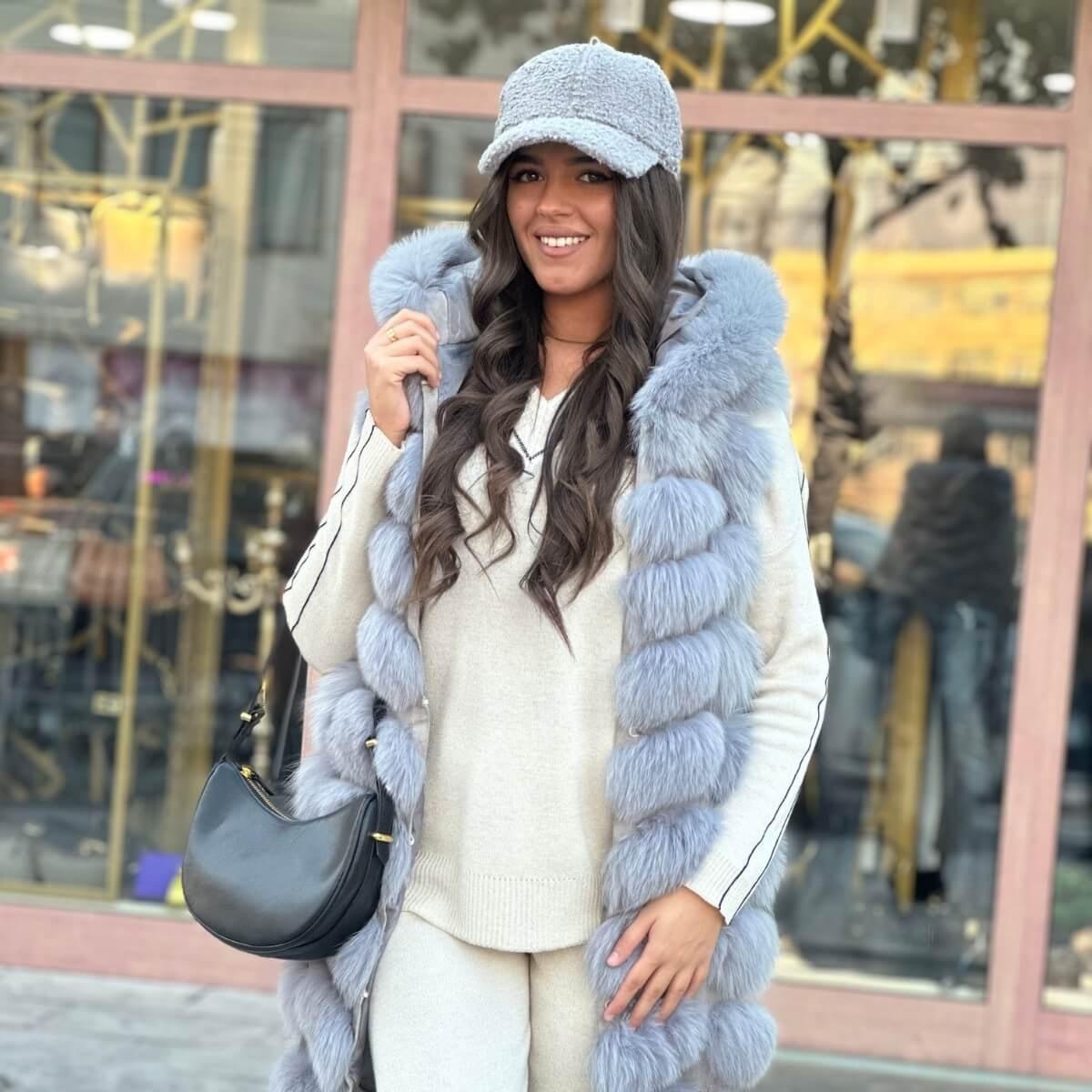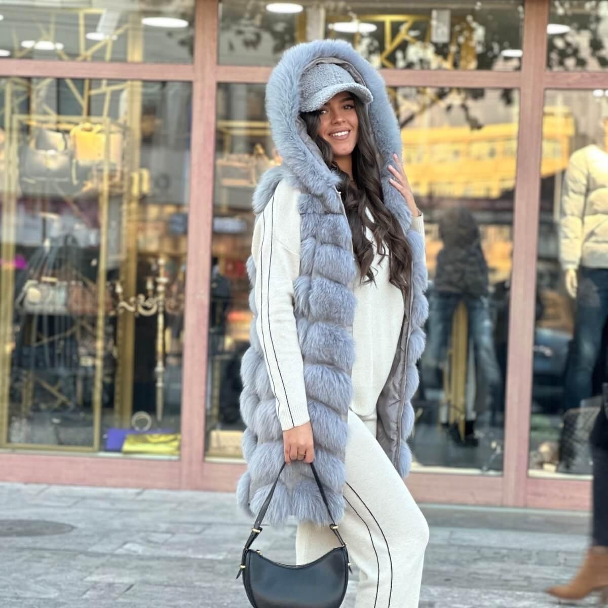 Otkrij savršeni spoj topline, luksuza i modernog izgleda uz dugi prsluk kapa 9RED od pravog prirodnog krzna. Ovaj model krasi raskošna kapuljača koja pruža dodatnu udobnost i zaštitu od hladnoće, dok duga silueta vizuelno izdužuje figuru i daje otmen izgled.