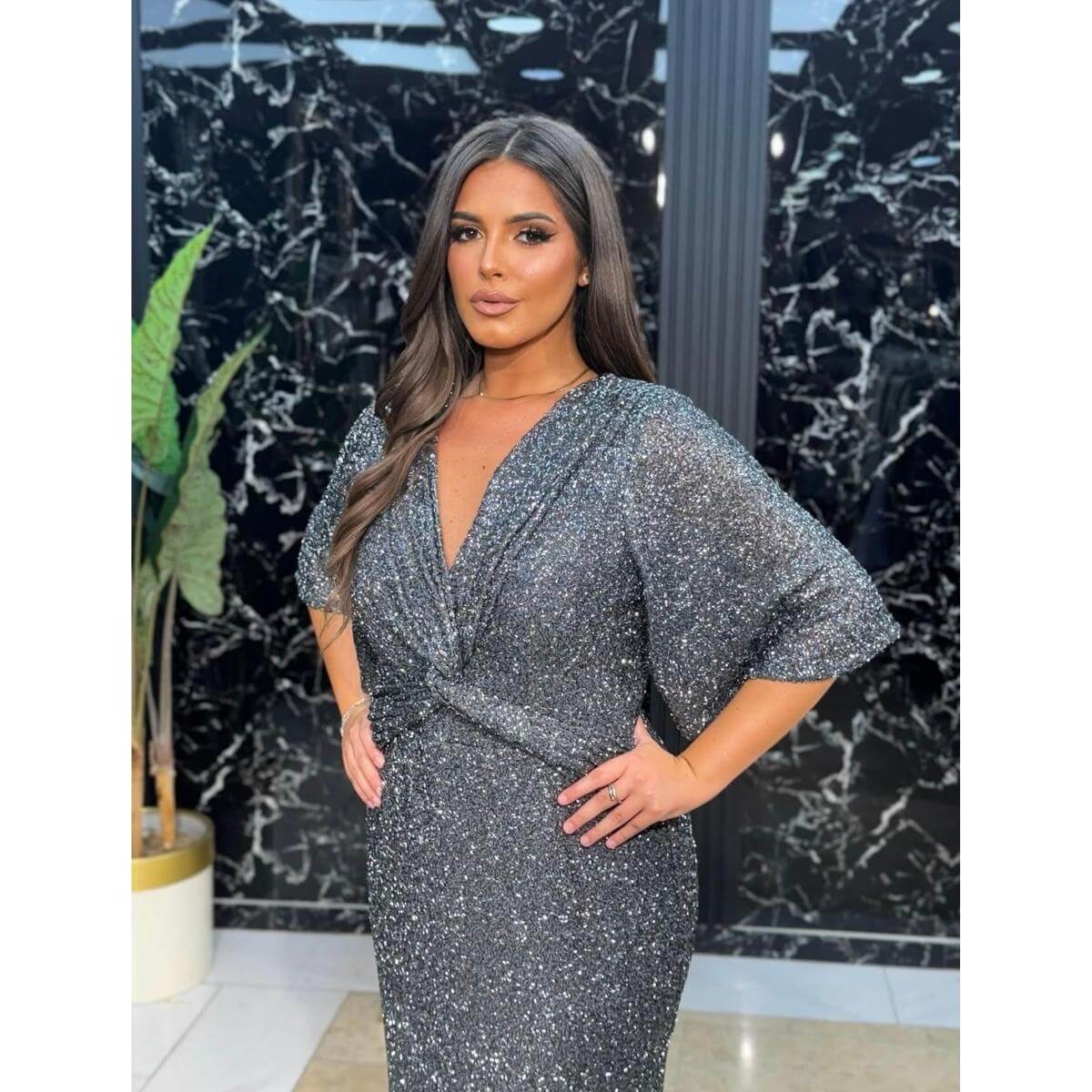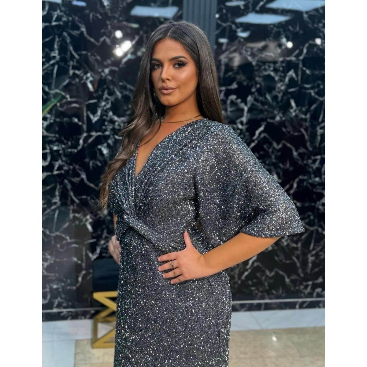 Svečana haljina izrađena od luksuznog materijala sa prefinjenim sedefastim sjajem koji haljini daje elegantan i glamurozan izgled. Kratki rukavi pružaju lakoću i udobnost, dok pažljivo krojena silueta ističe figuru i doprinosi sofisticiranom stilu. Ovaj model je idealan izbor za svečane prilike, proslave, večernje događaje i posebne trenutke kada želite da zablistate uz diskretnu, ali upečatljivu eleganciju.