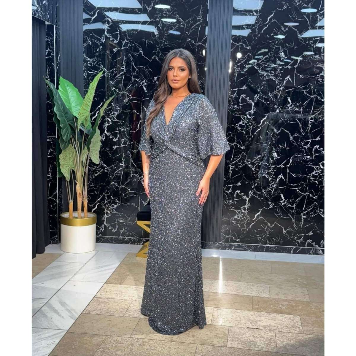 Duga svečana haljina sa pelerina rukavima i sedefastim sjajem