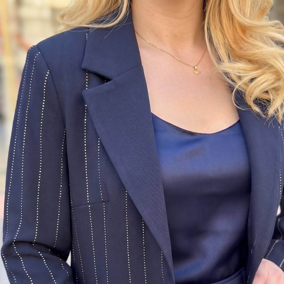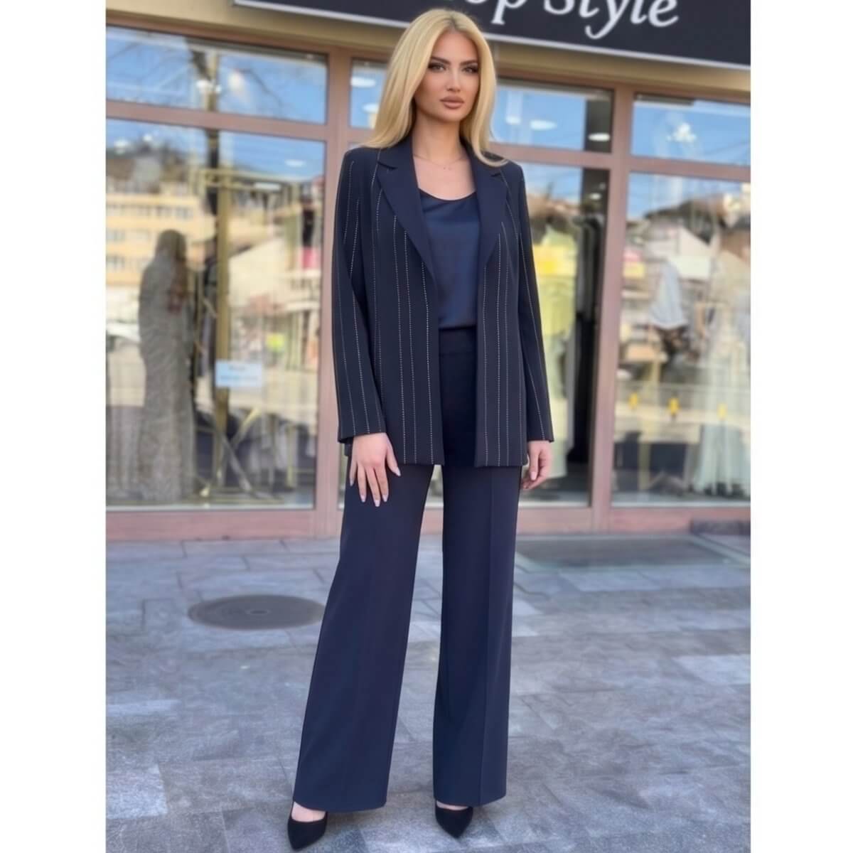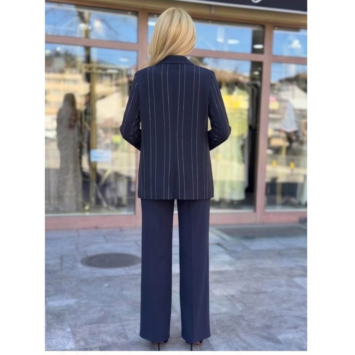 Moderan i sofisticiran teget komplet savršen je izbor za poslovne i svečane prilike. Sako ravnog kroja sa diskretnim vertikalnim linijama od cirkona vizuelno izdužuje siluetu i dodaje dozu luksuza svakom outfitu. Ispod možete iskombinovati jednostavan top koji upotpunjuje minimalistički, ali elegantan izgled.