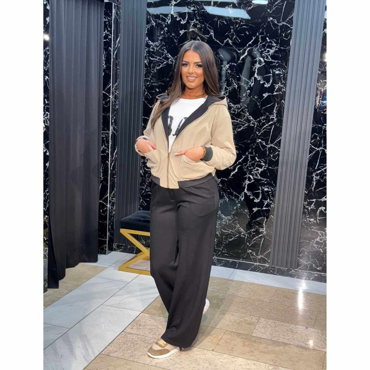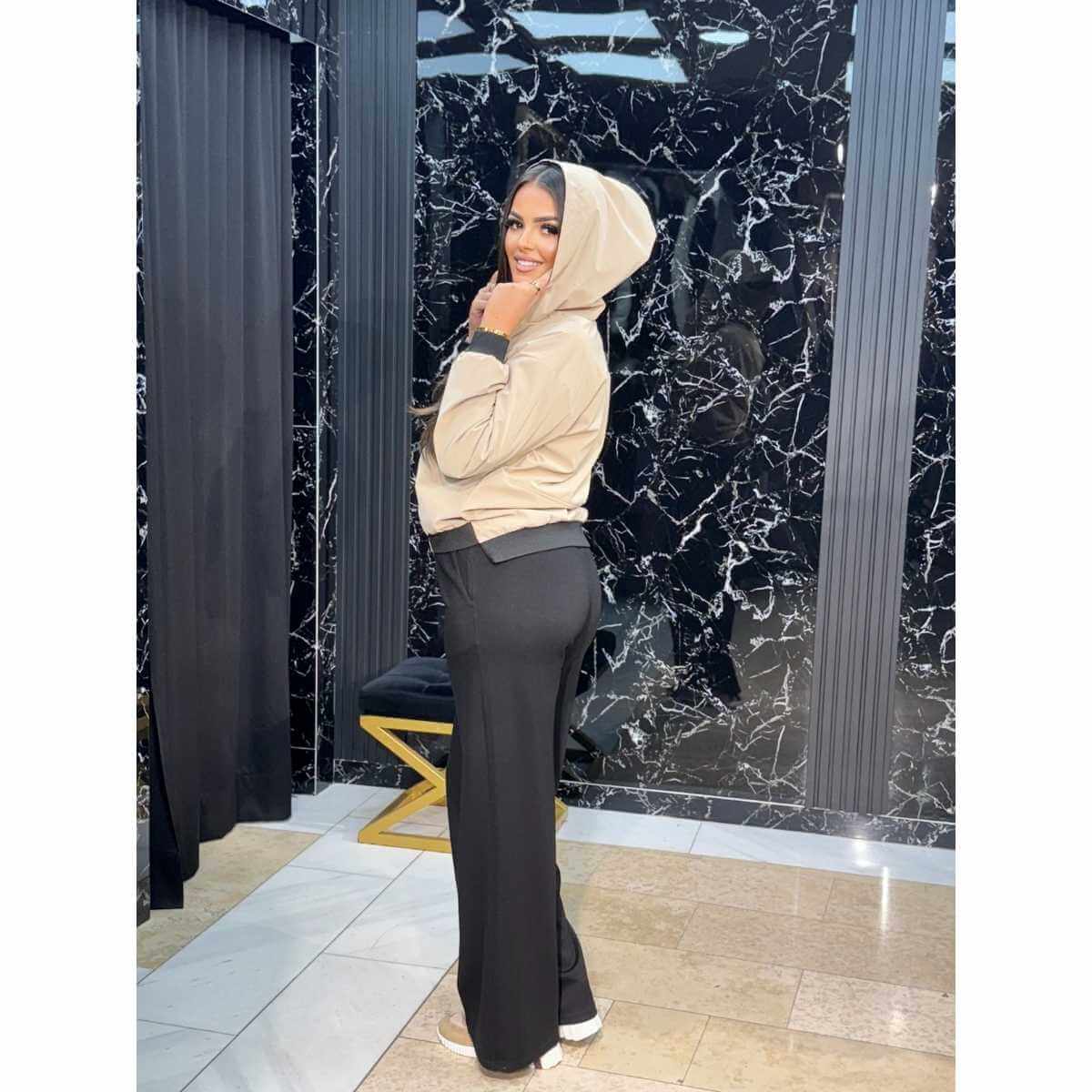 Ovaj trodelni bež i crni komplet sa belom majicom savršeno spaja sportski duh i elegantan izgled. Sastoji se od bež duksa sa crnim detaljima i rajsferšlusom, bele majice i crnih pantalona ravnog kroja sa džepovima, što ga čini praktičnim, ali i izuzetno modernim izborom.