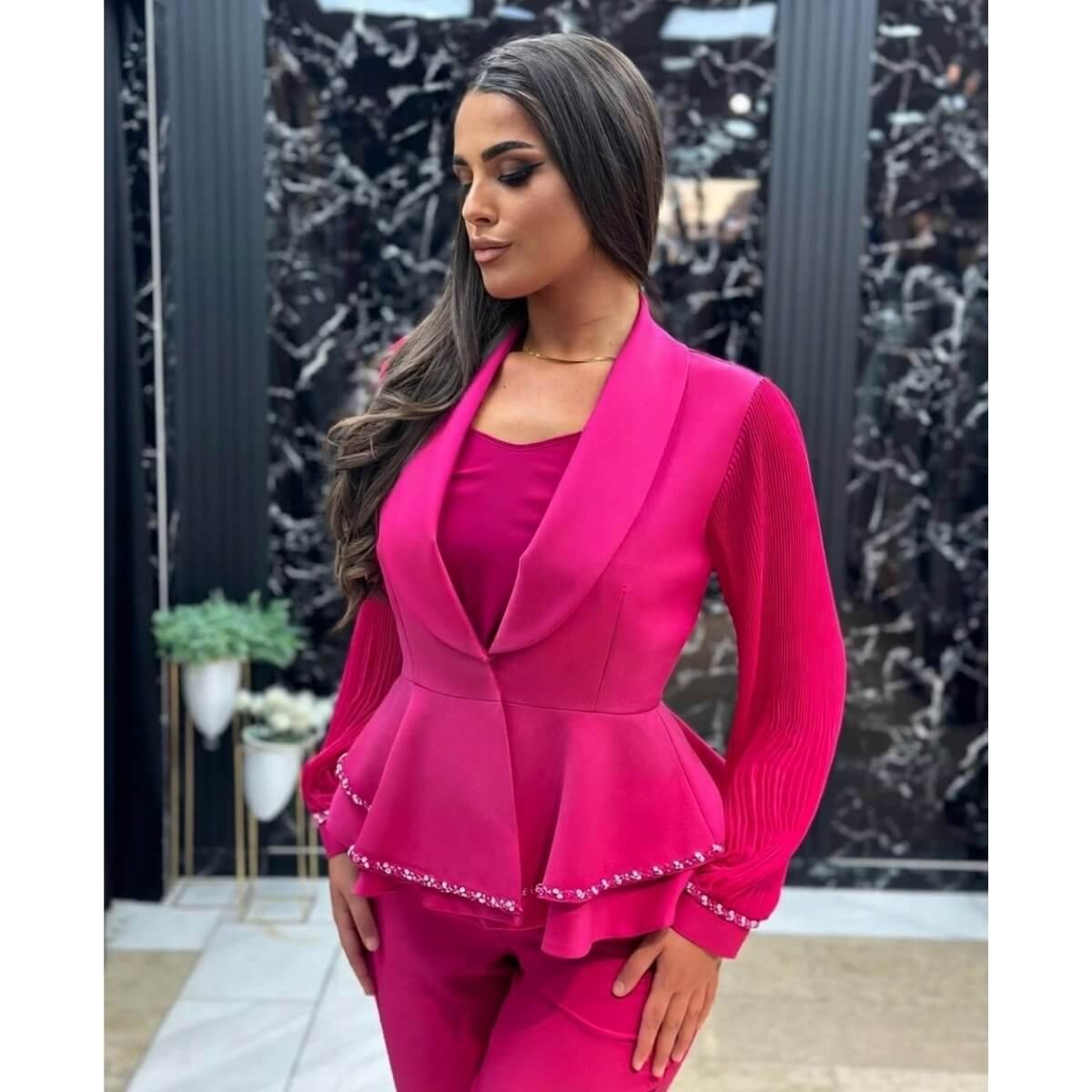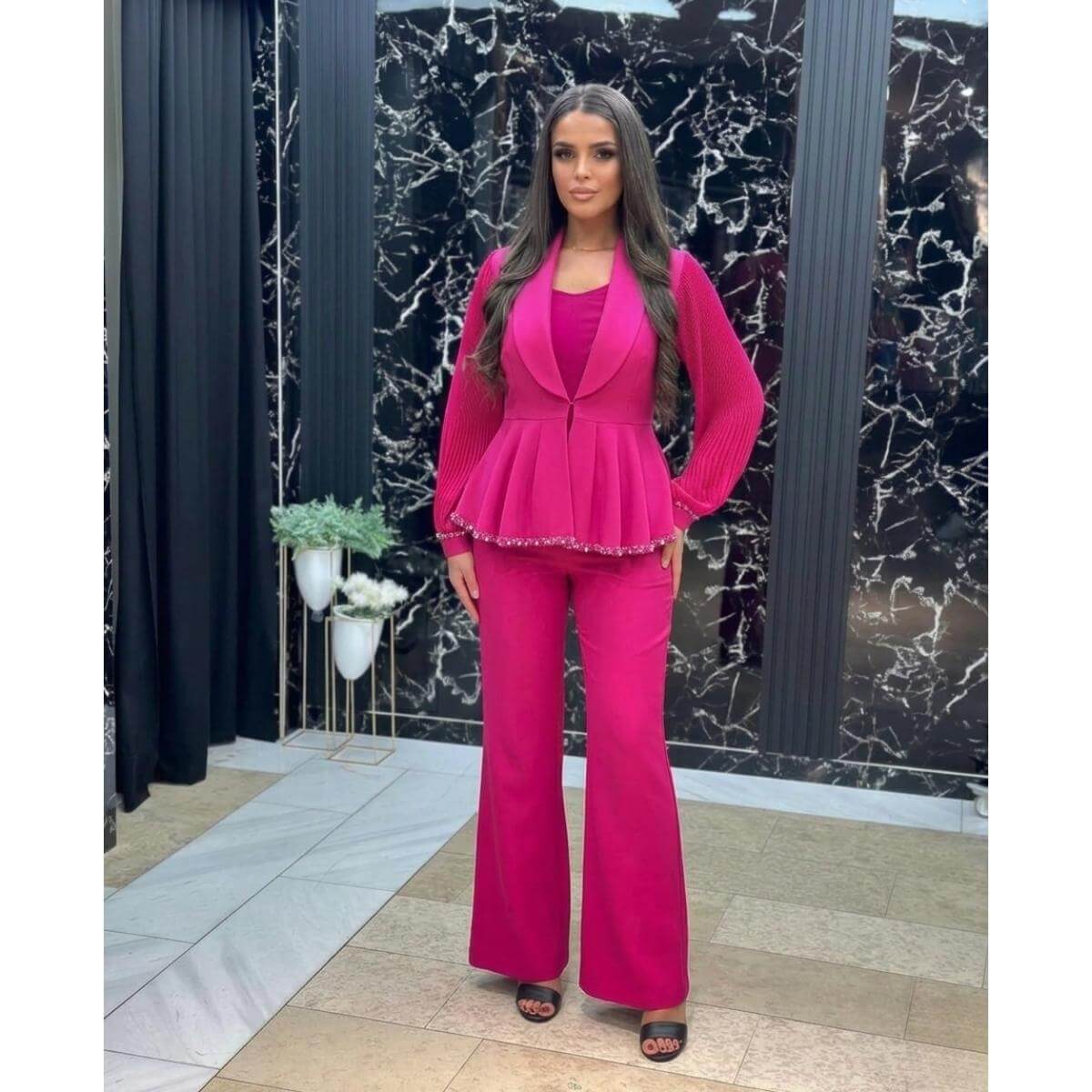 Ovaj moderan trodelni rozi komplet izrađen je za žene koje vole da izgledaju elegantno, upadljivo i samouvereno. Kreiran u intenzivno rozoj boji, savršeno ističe figuru i donosi dozu glamura svakom stajlingu. Elegantni sako sa cirkonima i pojasom u struku naglašava ženstvenost, dok pantalone ravnog kroja pružaju sofisticiran izgled i udobnost.