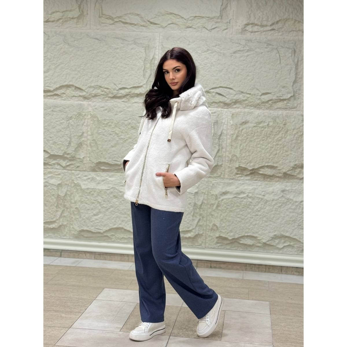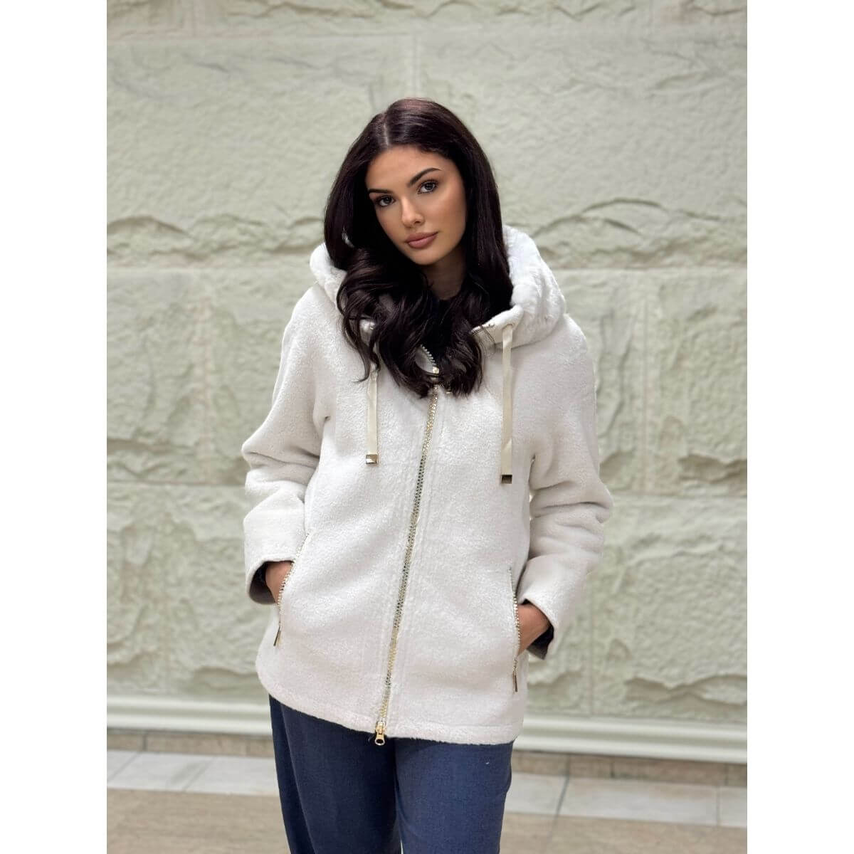 Moderan kroj lepo ističe siluetu, a kapuljača obezbeđuje dodatnu toplinu i zaštitu tokom zimskih dana. Bela boja u kombinaciji sa zlatnim detaljima čini ovu jaknu idealnim izborom za elegantne i urbane zimske kombinacije, kako za dnevne, tako i za večernje prilike.