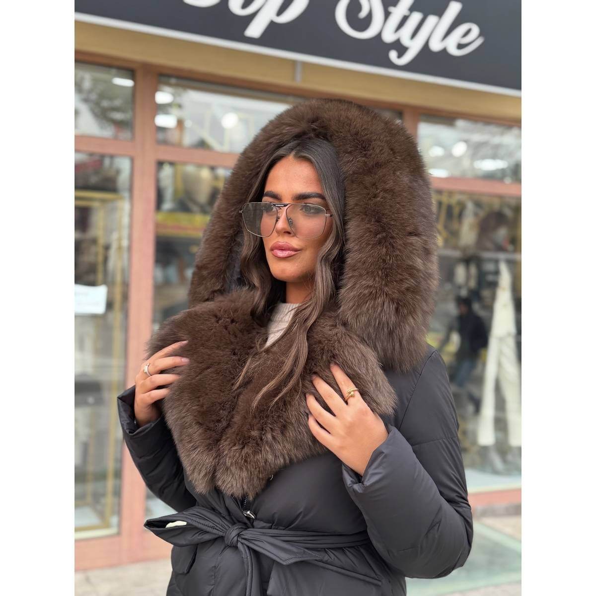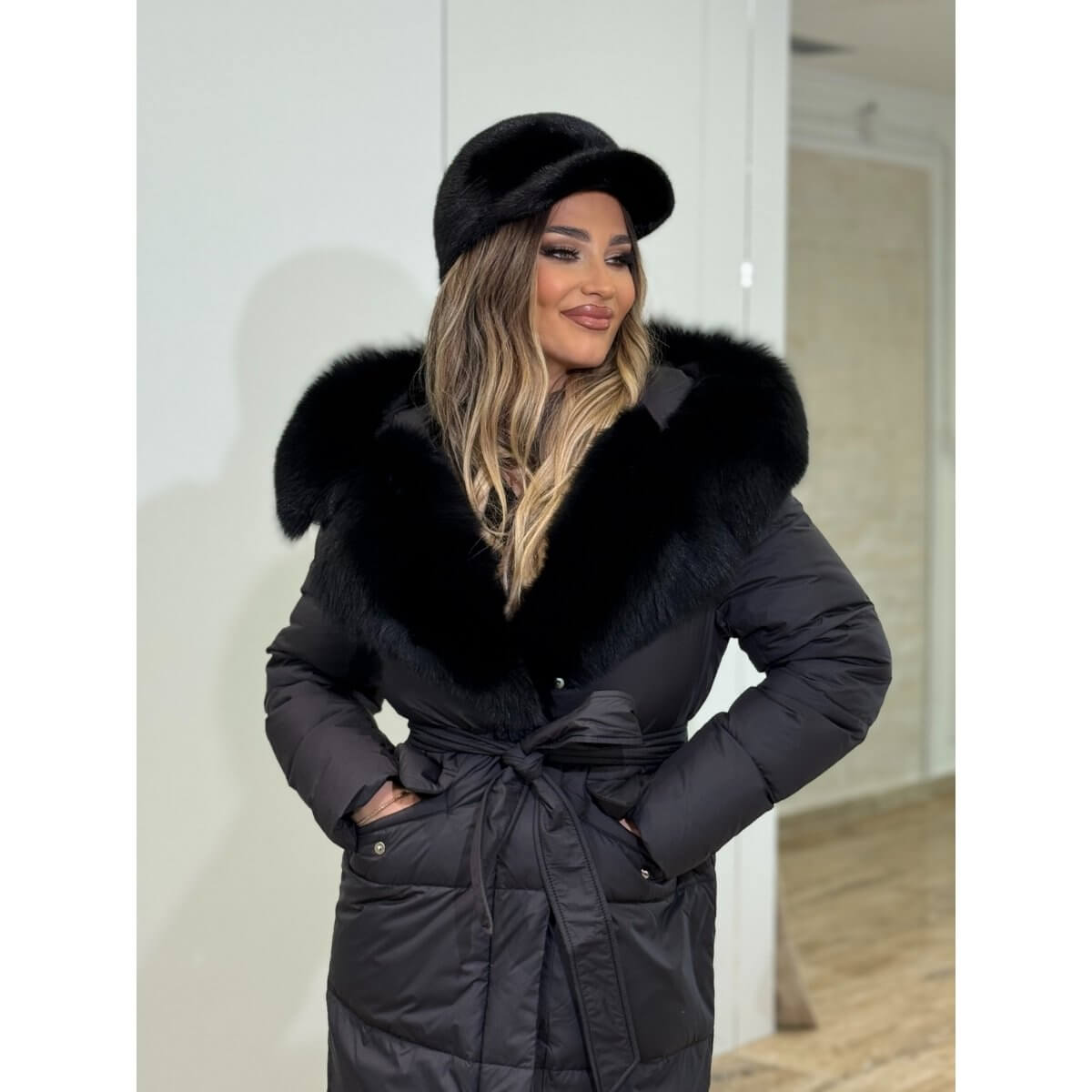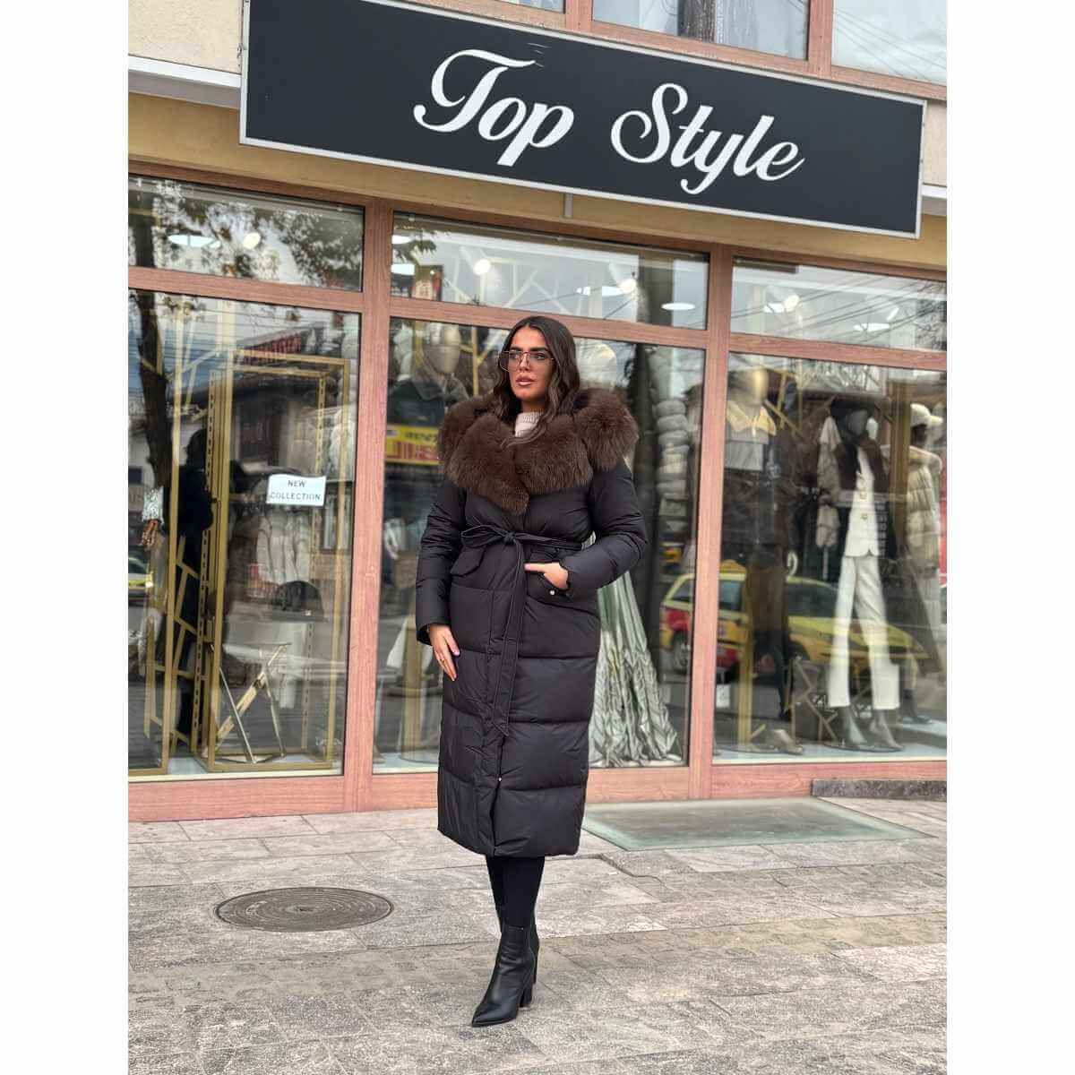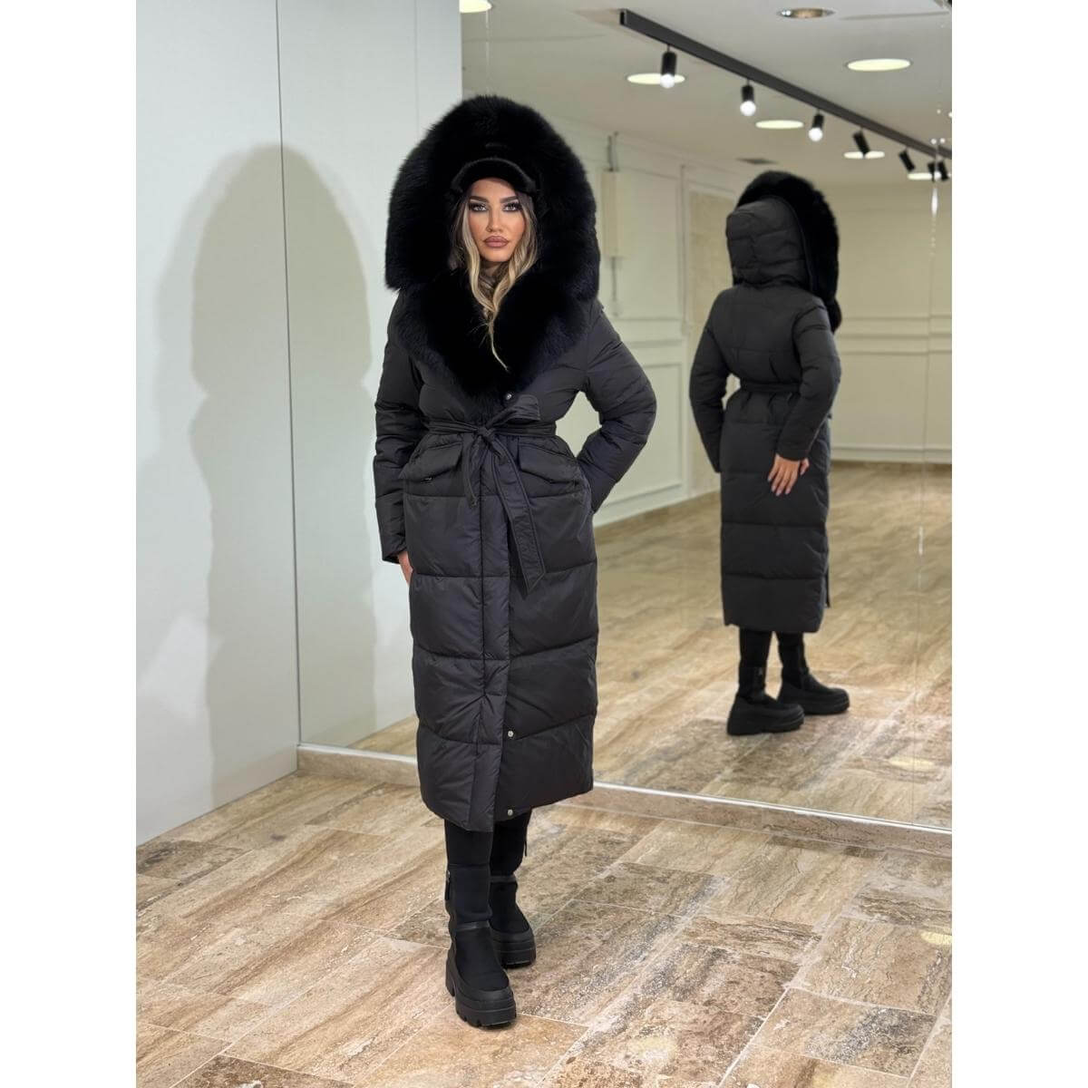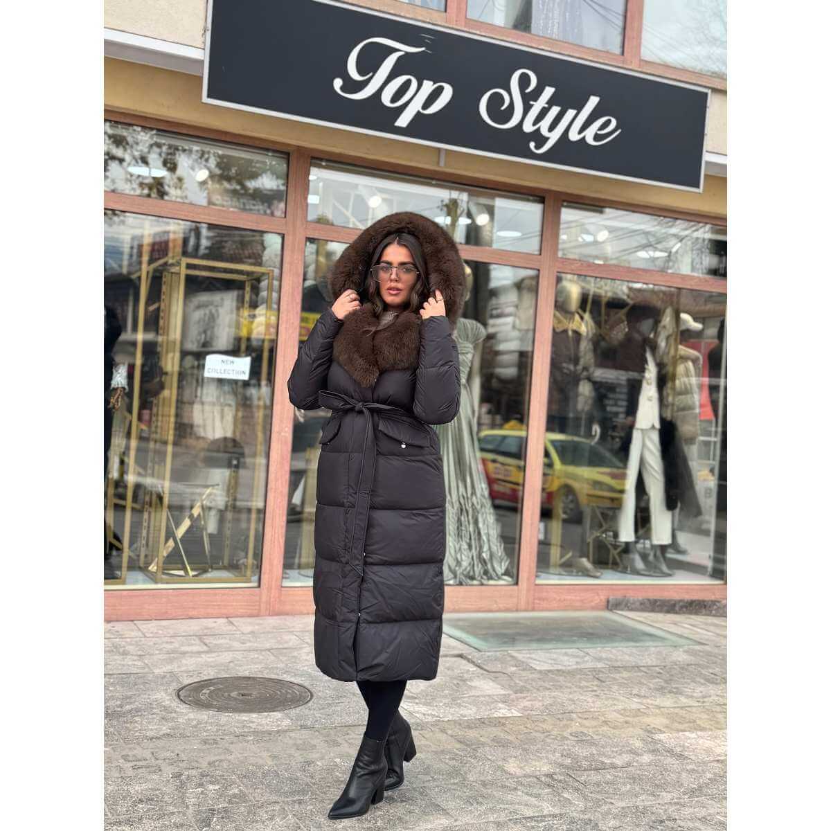 Zimska duga jakna sa prirodnim krznom, kapom i pojasom predstavlja savršen spoj luksuza, topline i ženstvene elegancije. Izrađena od kvalitetnih materijala, ova jakna pruža izuzetnu zaštitu od hladnoće, dok prirodno krzno daje sofisticiran i raskošan izgled.