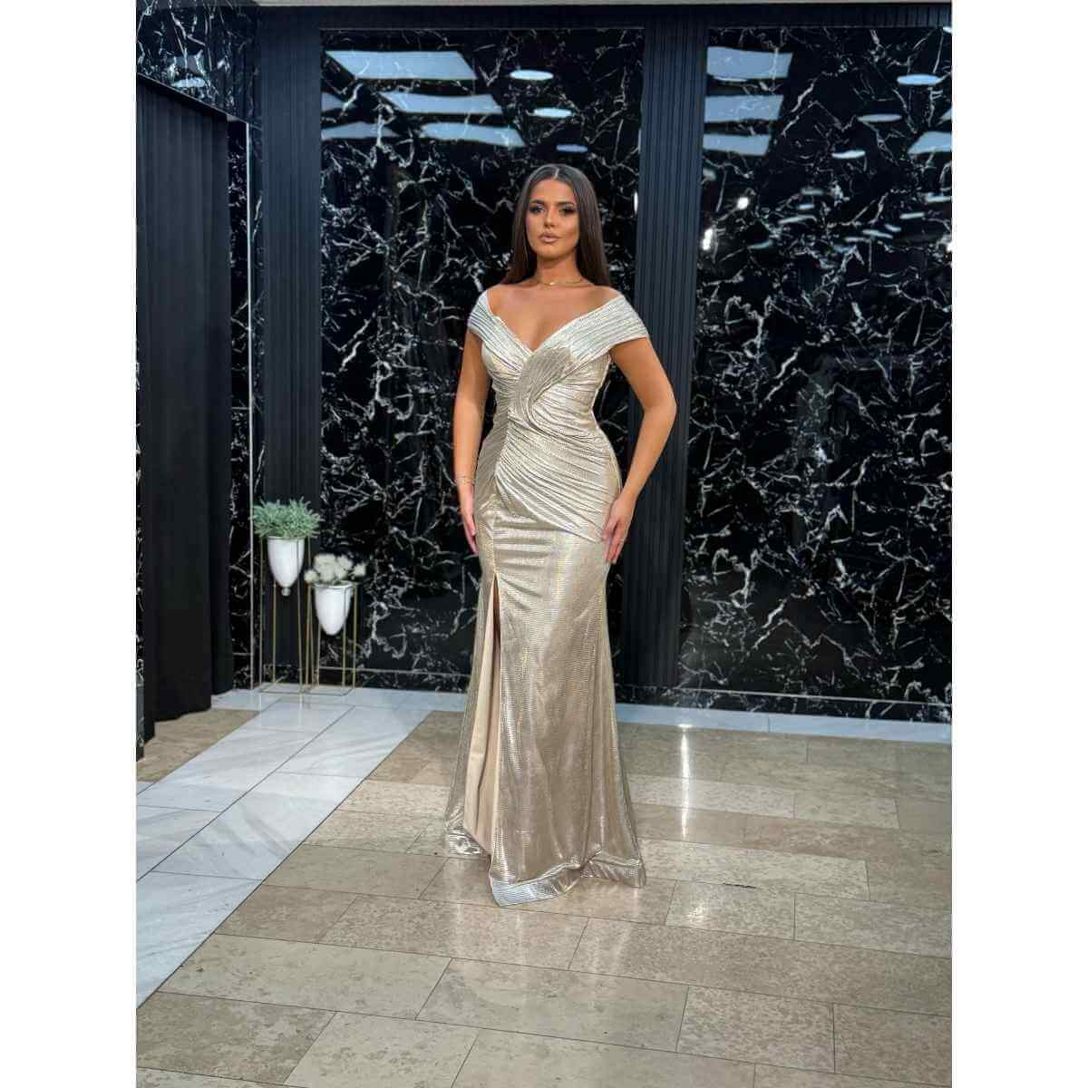 Istaknite svoju siluetu i zablistajte u punom sjaju uz ovu zlatnu bardot haljinu sa visokim šlicem, savršenu za svečane događaje i večernje prilike. Napravljena od luksuznog, sjajnog materijala koji podseća na tečno zlato, haljina reflektuje svetlost i stvara efekat glamura pri svakom pokretu.
